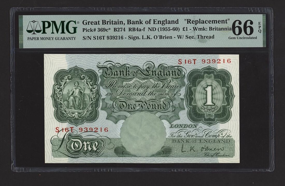 Bank of England, L.K. O'Brien, [Top Pop] replacement £1, ND (1955-60), serial number S16T 939216, (Pick 369c*, BNB 172, EPM B274 RB4a-f), in PMG holder 66 EPQ Gem Uncirculated