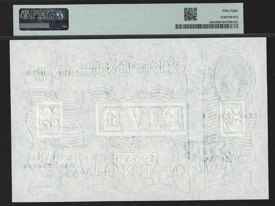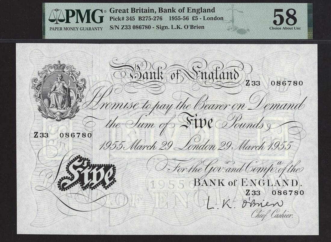 Bank of England, L.K. O'Brien, £5, London, 29th March 1955, serial number Z33 086780, (Pick 345, BNB 177, EPM B275-276), in PMG holder 58 Choice About Uncirculated