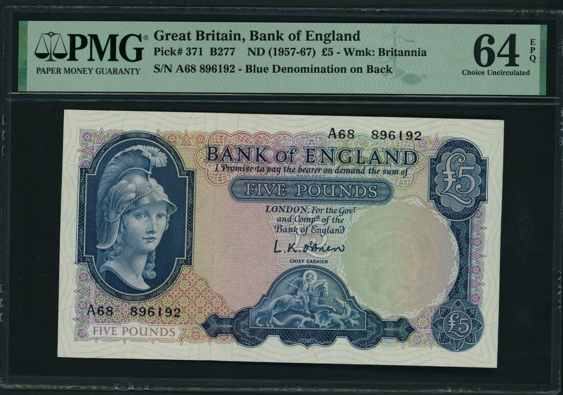 Bank of England, L.K. O´Brien £5, ND (1957-67), serial number A68 896192, (Pick 371, EPM B277, BNB 178), in PMG holder 64 EPQ Choice Uncirculated