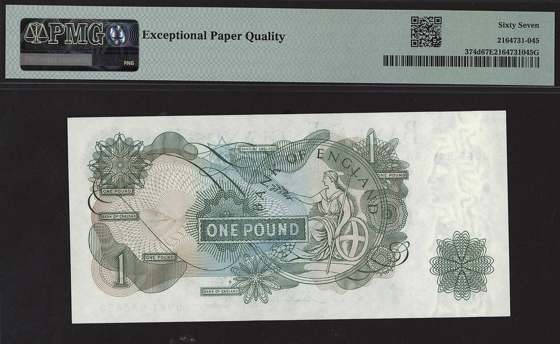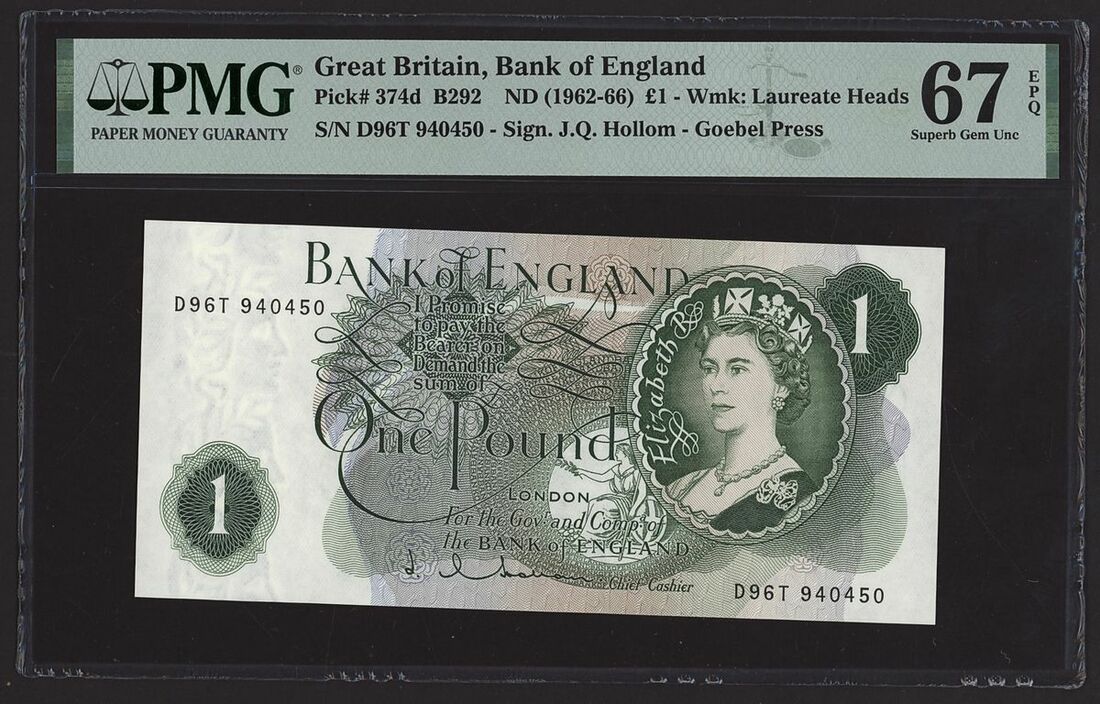 Bank of England, J.Q. Hollom, [Top Pop] £1, ND (1962-66), serial number D96T 940450, (Pick 374d, EPM B292, BNB 180), in PMG holder 67 EPQ Superb Gem Uncirculated