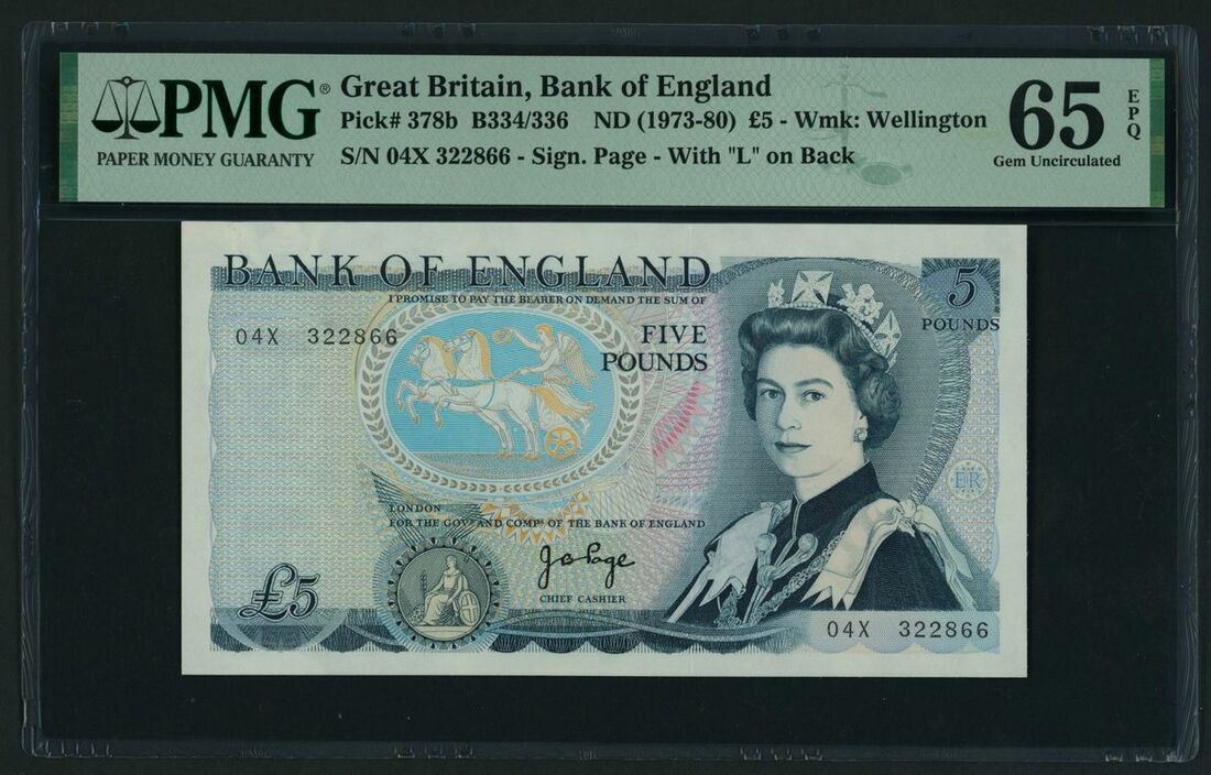 Bank of England, Page, £5, ND (1973-80), serial number 04X 322866, (Pick 378b, EPM B334/336, BNB 185), in PMG holder 65 EPQ Gem Uncirculated