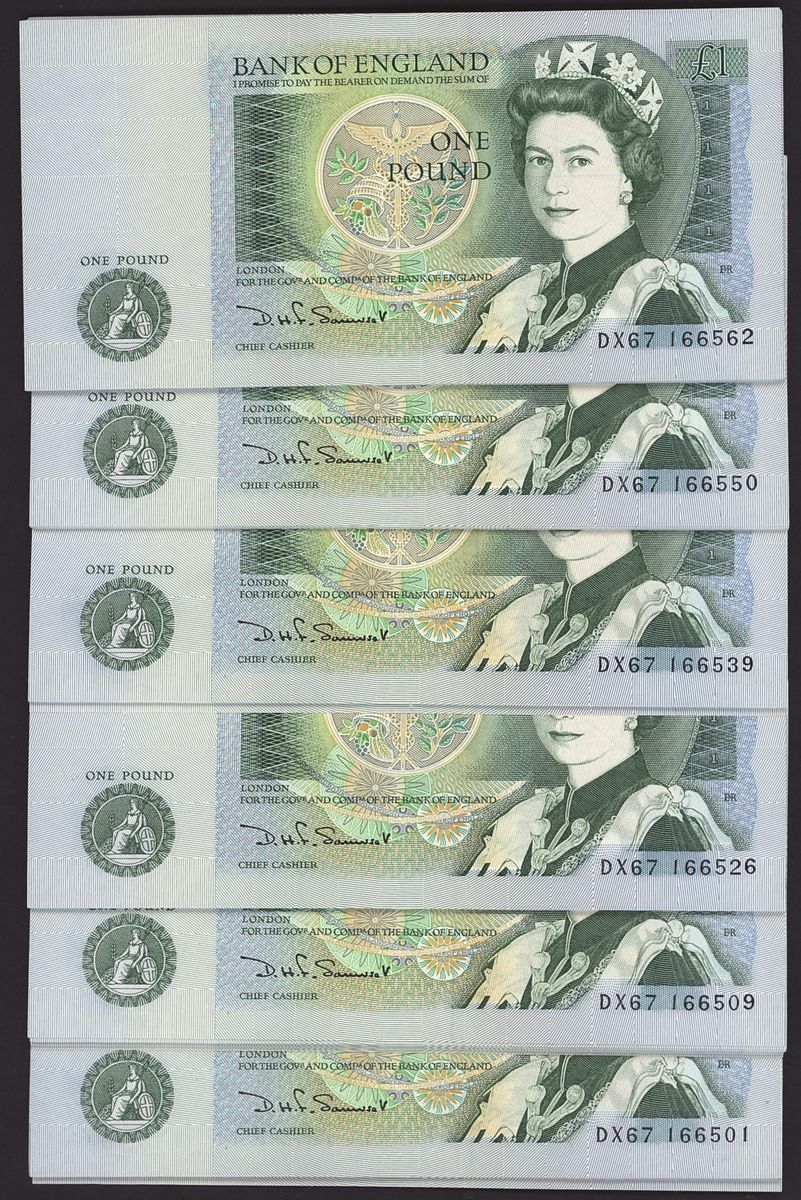 Great Britain, Bank of England, 297 notes, £1, London, ND (1981-84), four groups of consecutive serial numbers four groups of consecutive serial numbers, as follows: 97 notes running consecutively serial numbers DX66 166780 - DX66 166876; 21 notes running consecutively serial numbers DX66 166978 - DX66 167000; 79 notes running consecutively serial numbers DX67 166501 - DX67 166579; 100 notes running consecutively serial numbers DX67 166680 - DX67 166779.