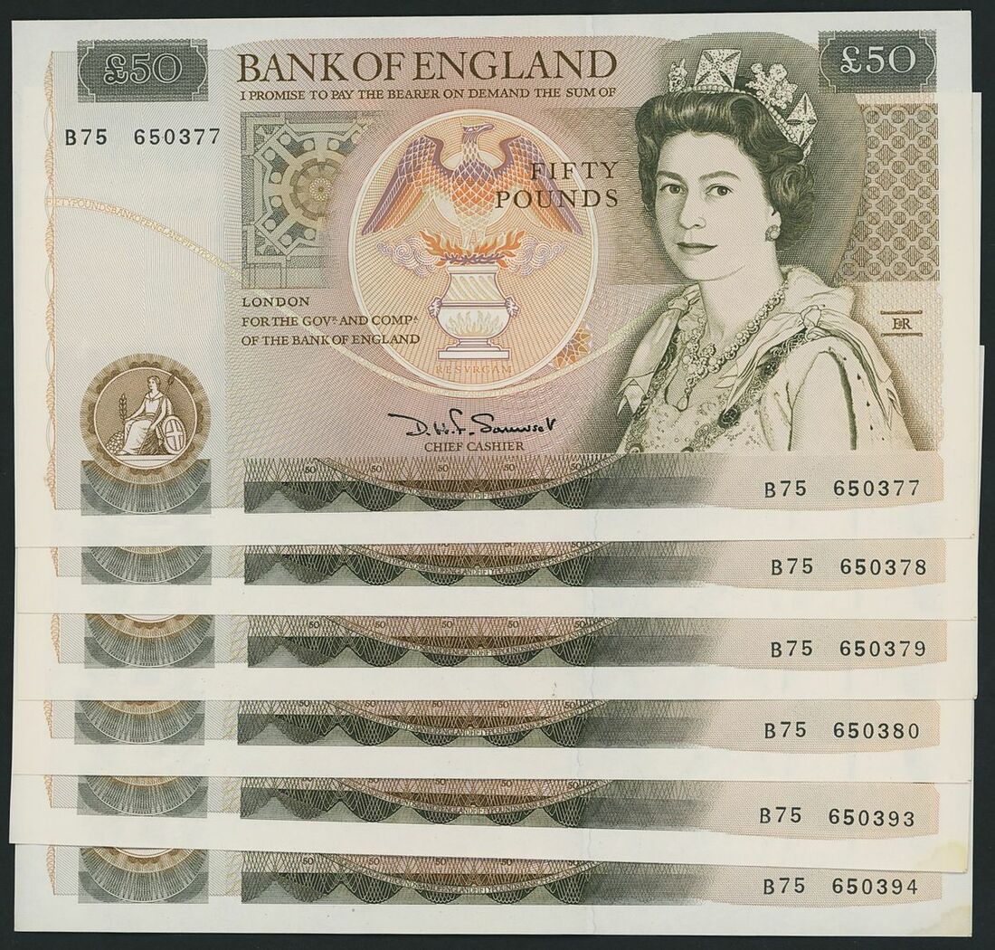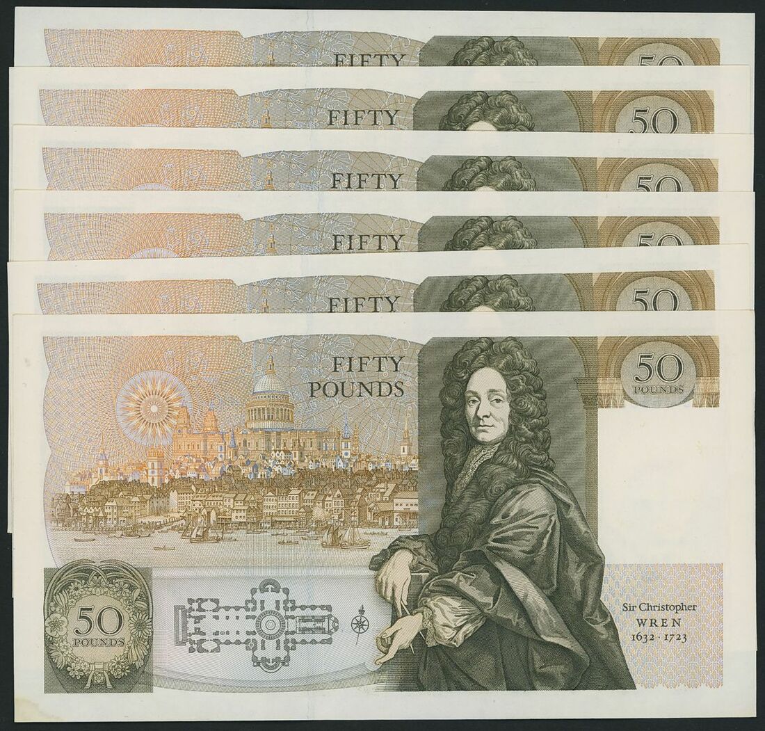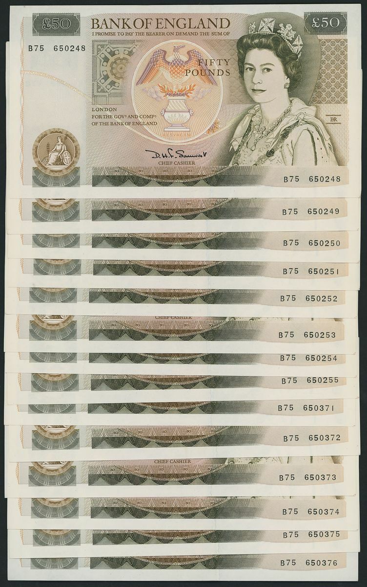 Great Britain, Bank of England, 20 notes, £50, London, ND (1981-93), this collection of Bank of England notes contains three runs of consecutive serial numbers. On the front side, these notes proudly display the beloved portrait of the late Queen Elizabeth II, while the reverse side showcases Christopher Wren alongside illustrations of his iconic architectural masterpiece: London's St Paul's Cathedral