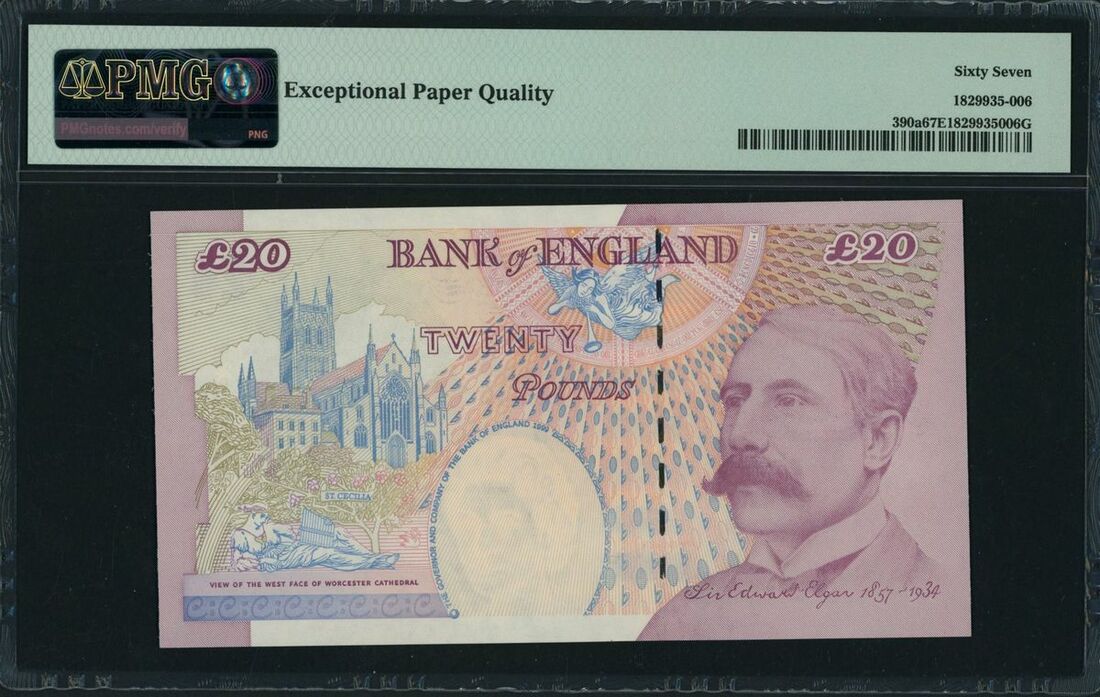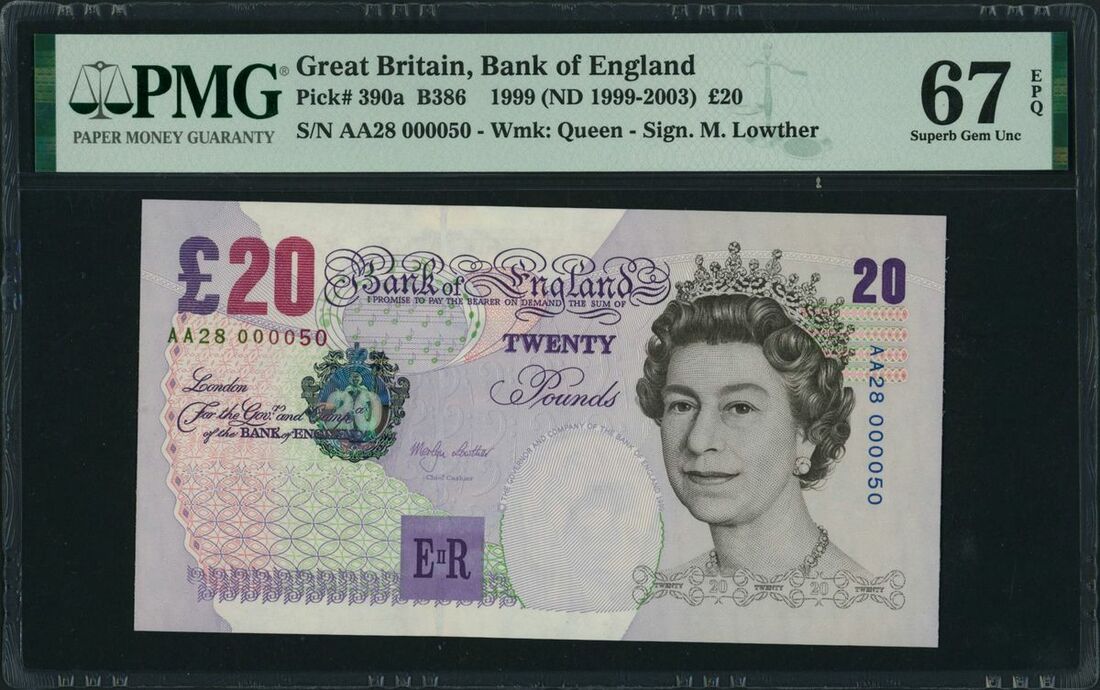 Bank of England, M. Lowther, £20, 1999 (ND 1999-2003), serial number AA28 000050 (Pick 390a, EPM B386), in PMG holder 67 EPQ Superb Gem Uncirculated