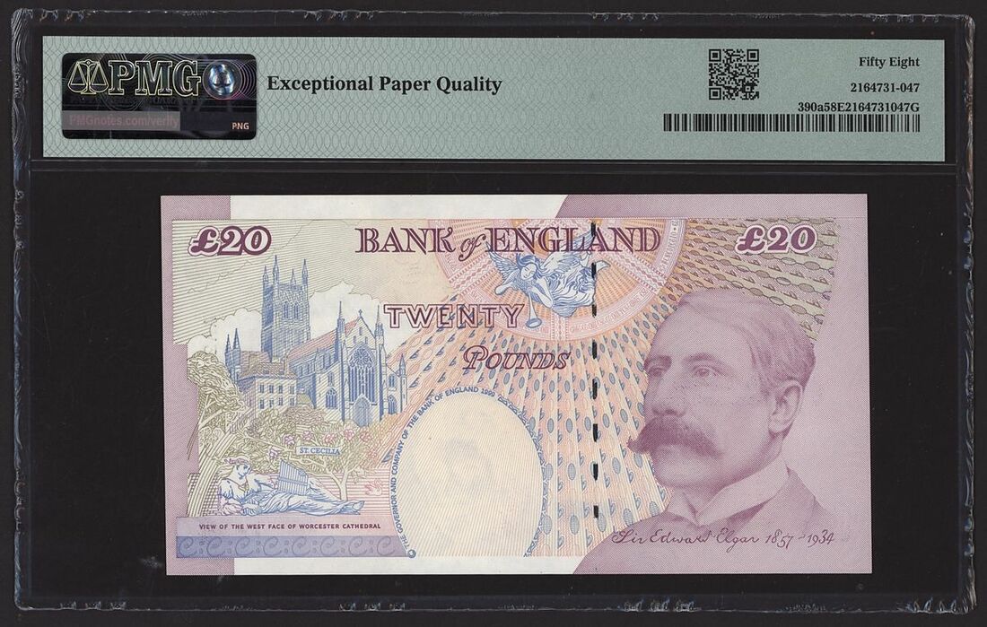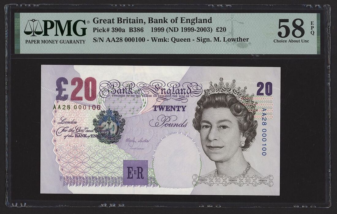 Bank of England, M. Lowther, £20, 1999 (ND 1999-2003), serial number AA28 000100, (Pick 390a, EPM B386, BNB 200), in PMG holder 58 EPQ Choice About Uncirculated