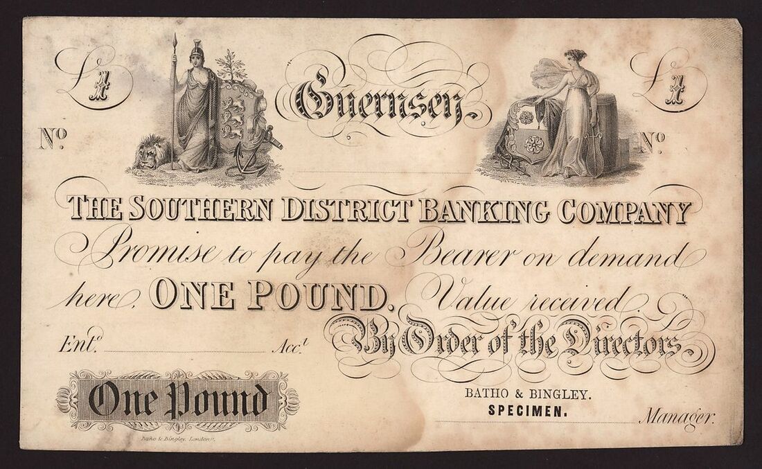 Guernsey, The Southern District Banking Company, Specimen £1, ND, no serial number, possibly connected to the Guernsey Branch of the Isle of Wight Southern District Company (c.1838), but this failed in 1940. Note was engraved by the firm Batho and Bingley, Lombard Street, London (c.1841-1853)