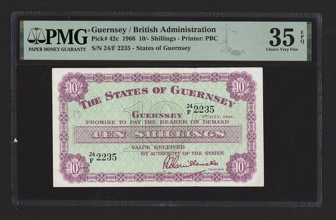 (x) States of Guernsey, British Administration, 10/- Shillings, 1st July 1966, serial number 24/F 2235, (Pick 42c, BNB 147), in PMG holder 35 EPQ Choice Very Fine
