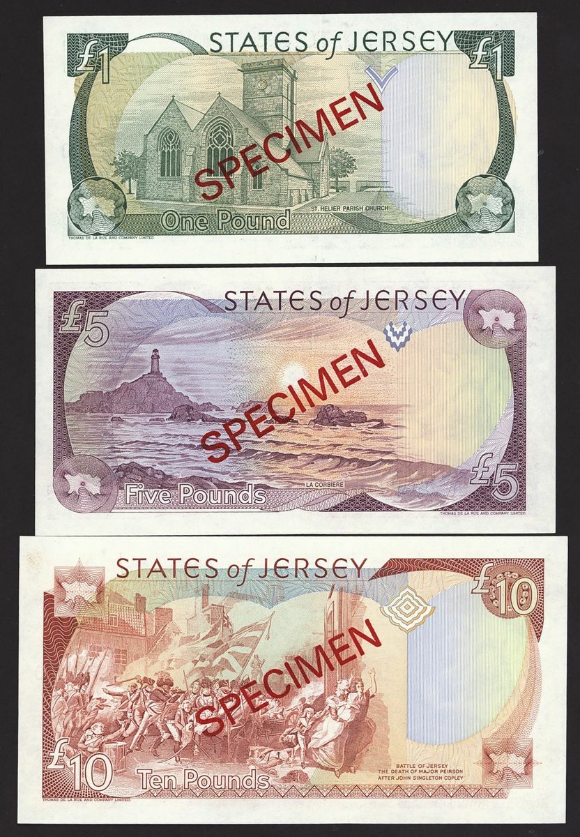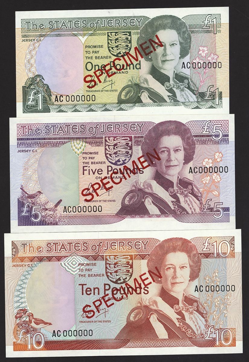 States of Jersey, [3 notes] specimens, £1, £5, £10, ND (1989), serial numbers AC 000000, (Pick 15s, 16s, 17s, BNB 115as, 116as, 117as), uncirculated, counting creases (3 notes)