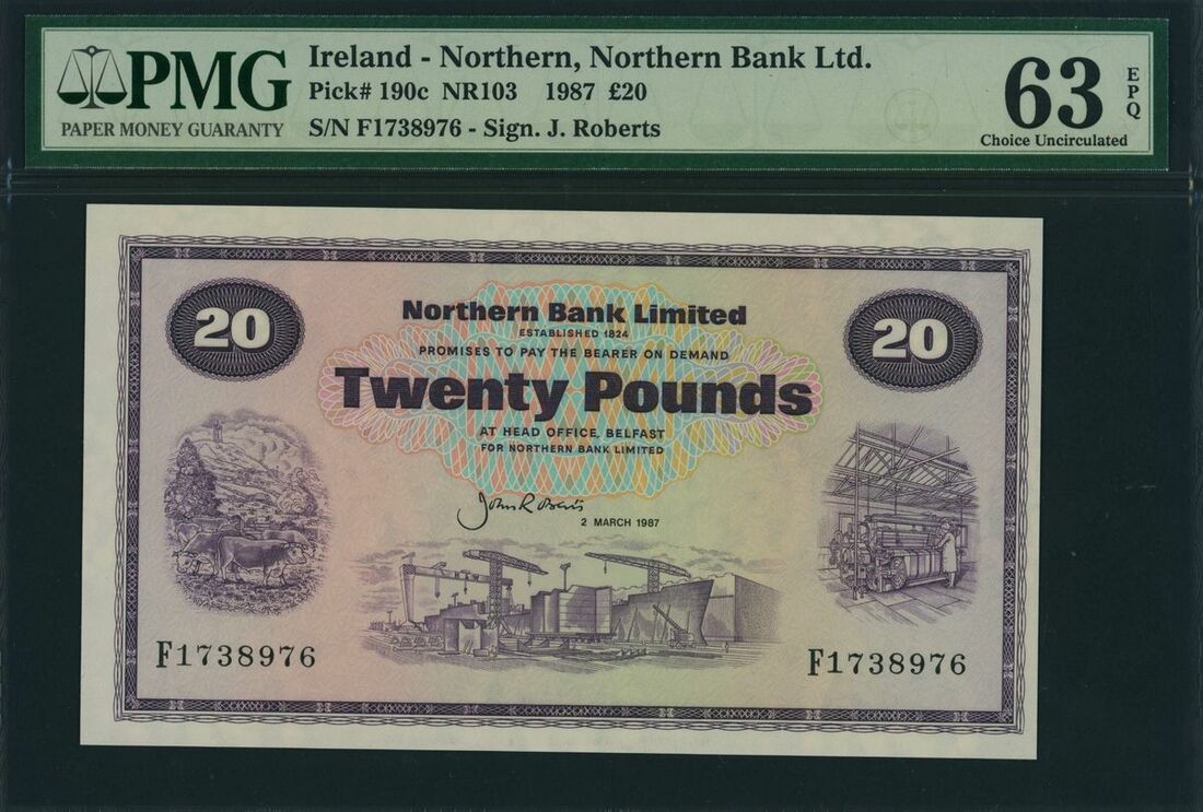(x) Northern Ireland, Northern Bank Ltd, £20, Belfast, 2nd March 1987, serial number F1738976, (Pick 190c, BNB 419d), in PMG holder 63EPQ Choice Uncirculated