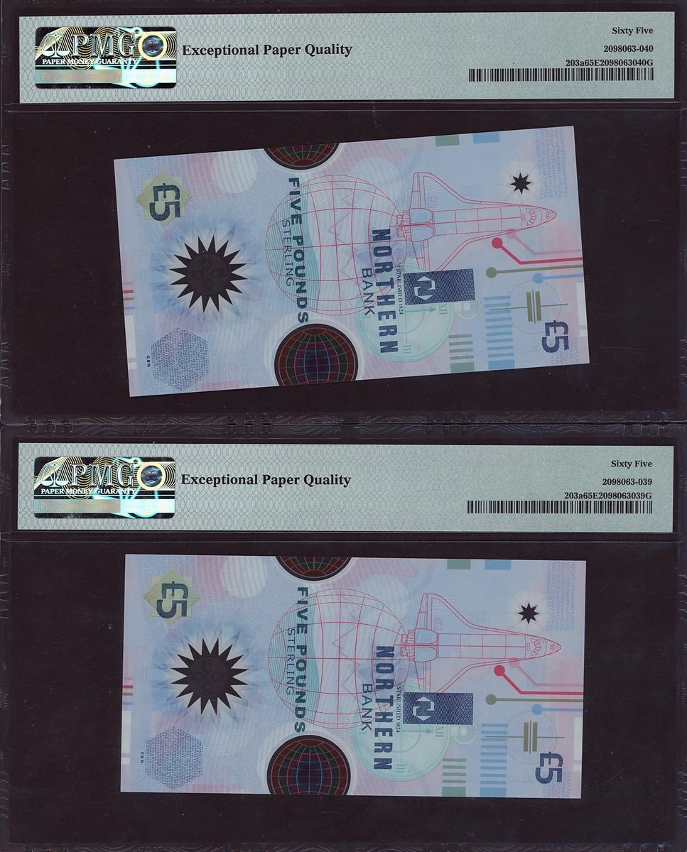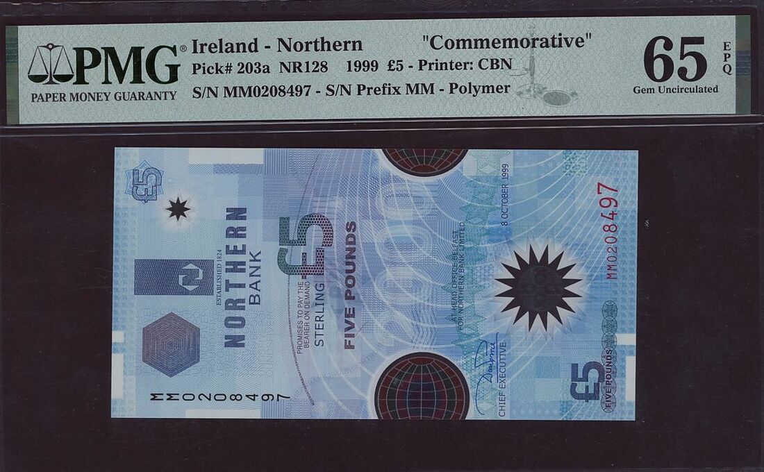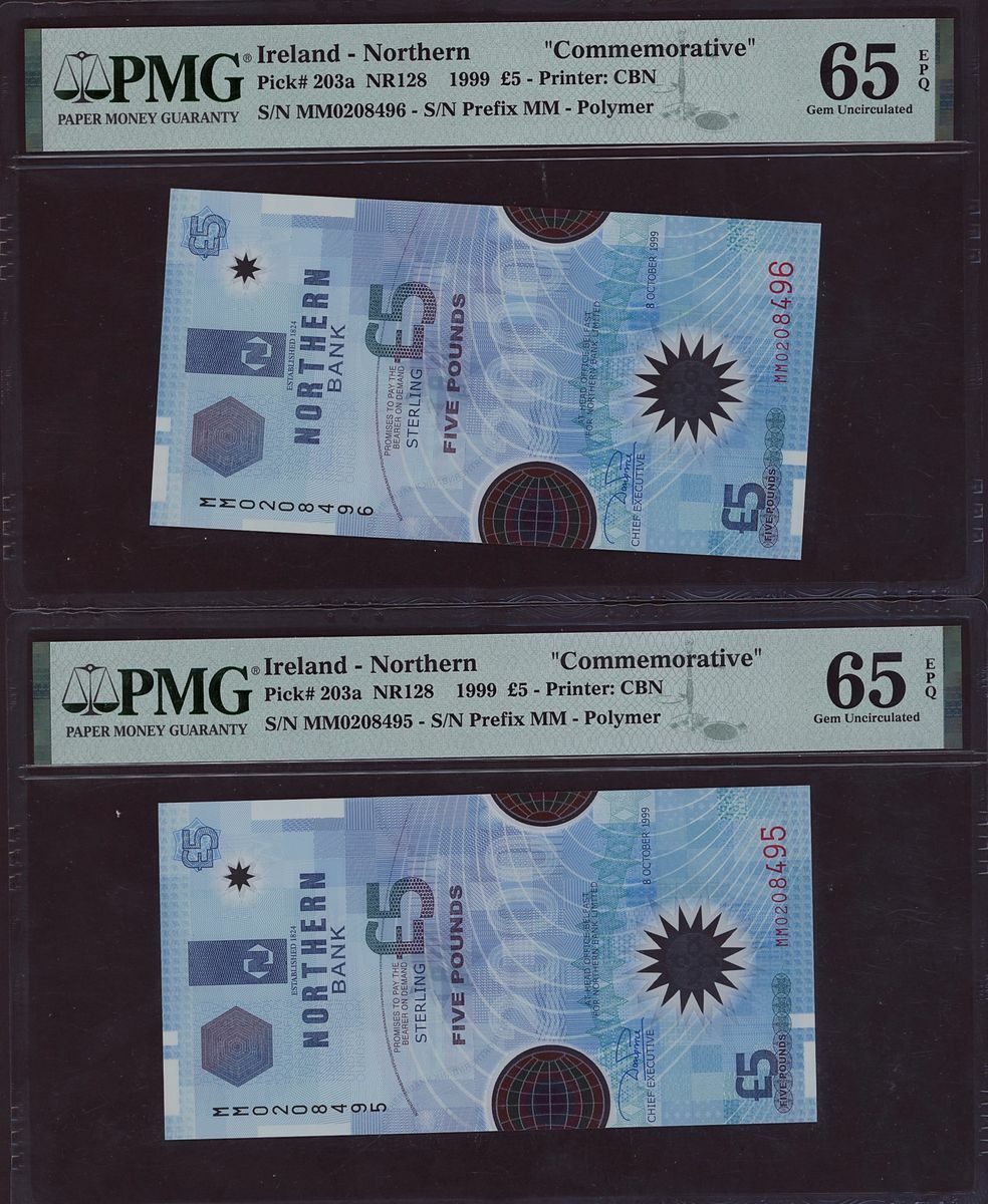 Northern Ireland, commemorative, three notes, £5, 8th October 1999, consecutive serial numbers, (Pick 203a, 203a, 203a, BNB 432a, 432a, 432a), all in PMG holders 65EPQ Gem Uncirculated
