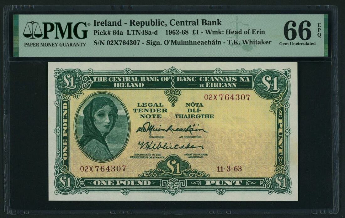 Central Bank of Ireland, £1, 11th March 1963, serial number 02X764307, (Pick 64a, LTN 48a-d, BNB 209), in PMG holder 66 EPQ Gem Uncirculated