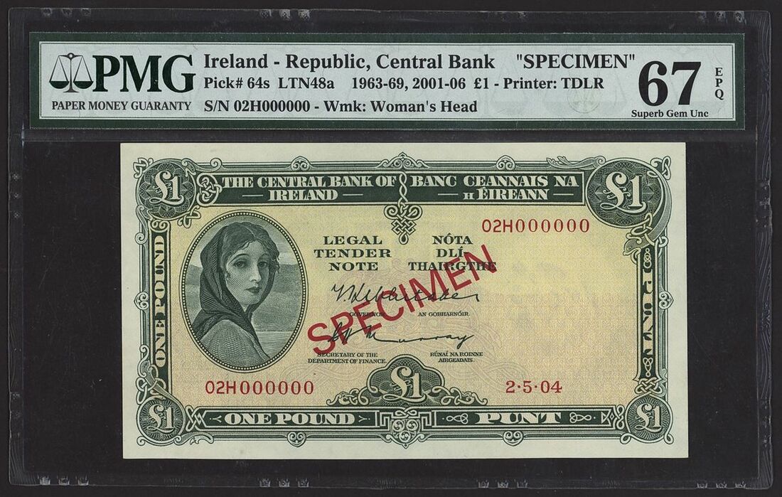 The Central Bank of Ireland, specimen £1, 1961-77, serial number 02H000000, (Pick 64s, BNB B209s), in PMG holder 67 EPQ Superb Gem Uncirculated