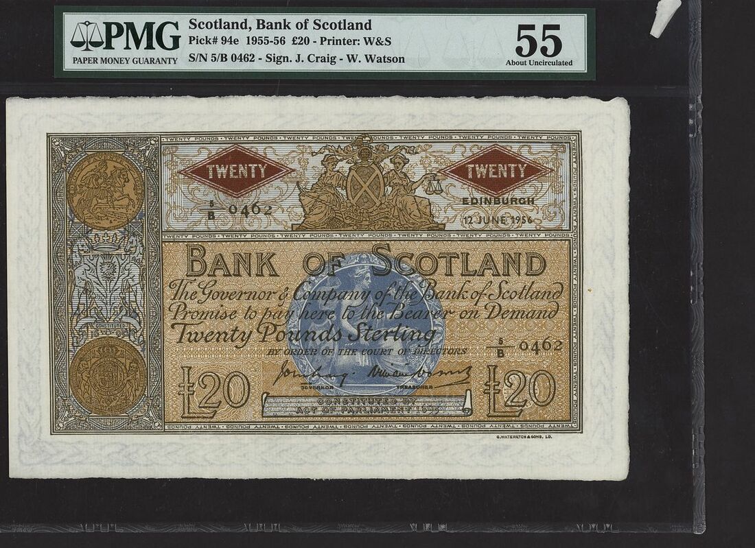 (x) Bank of Scotland, [Top Pop] £20, 12th June 1956, serial number 5/B 0462, (Pick 94e, BA 109e), in PMG holder 55 About Uncirculated