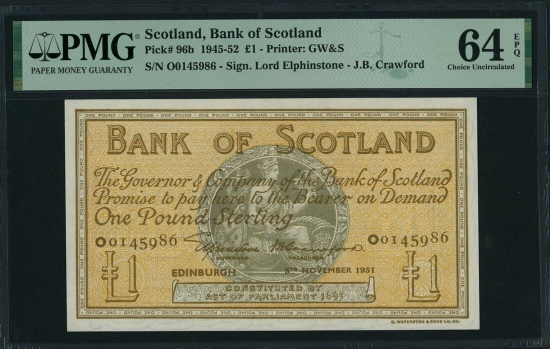 (x) Scotland, Bank of Scotland, £1, Edinburgh, 5th November 1951, serial number O0145986, (Pick 96b), in PMG holder 64EPQ Choice Uncirculated