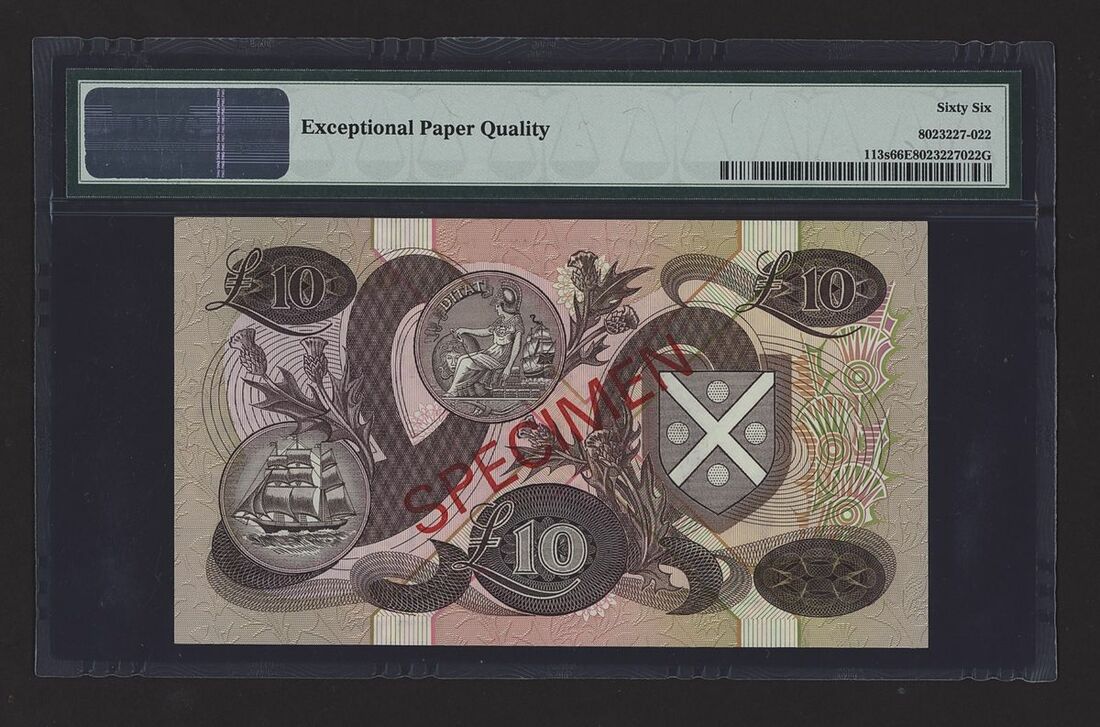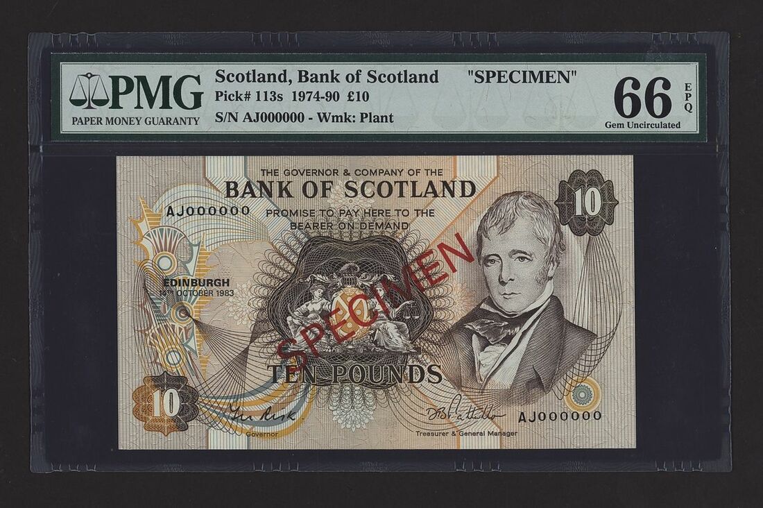 (x) Bank of Scotland, specimen £10, 14th October 1983, serial number AJ000000, (Pick 113s), in PMG holder 66 EPQ Gem Uncirculated