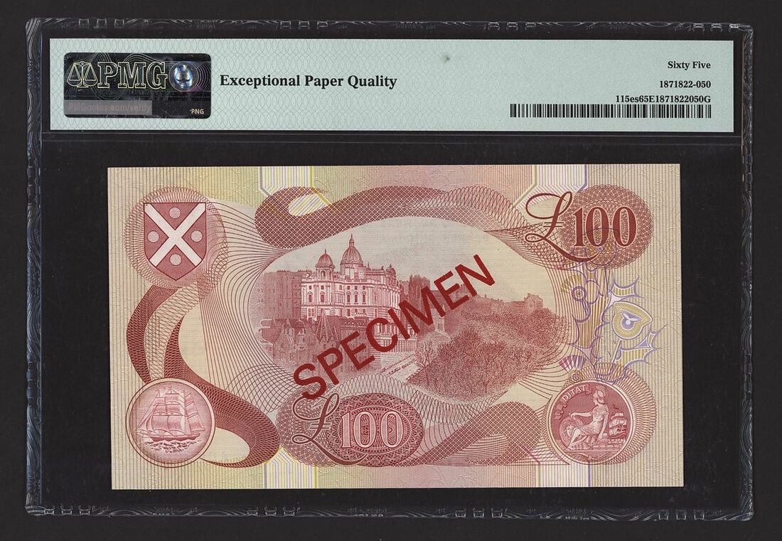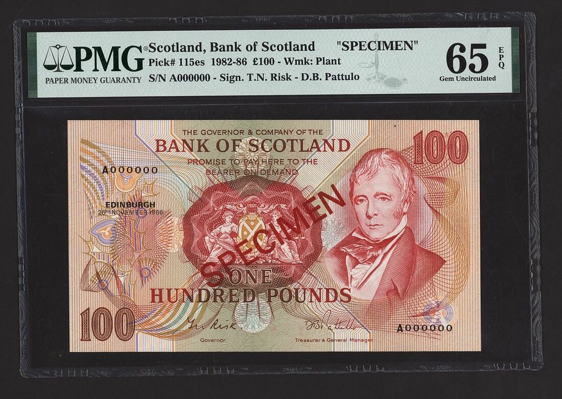 (x) Bank of Scotland, specimen £100, 26th November 1986, serial number A000000, (Pick 115es), in PMG holder 65 EPQ Gem Uncirculated