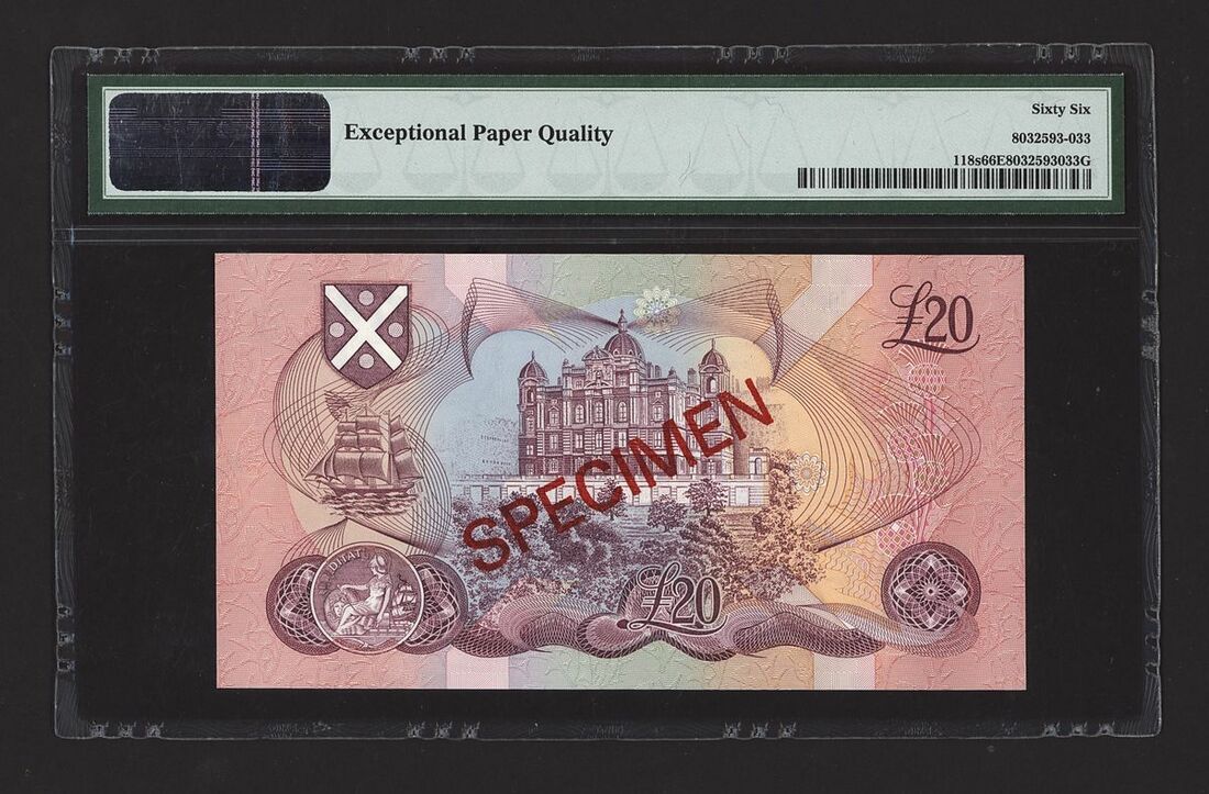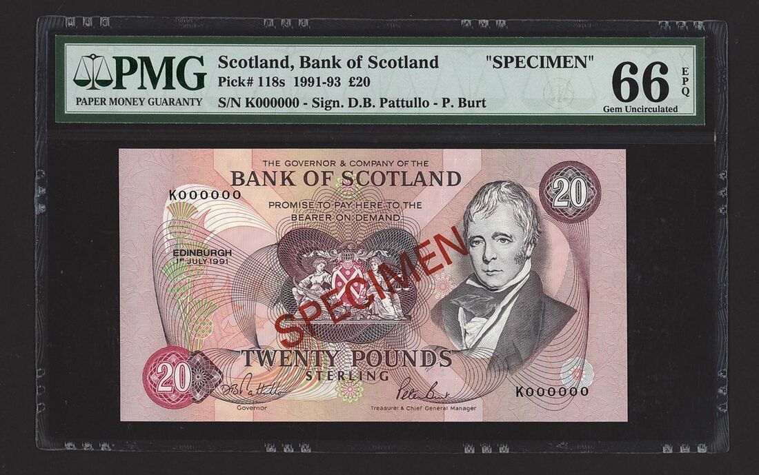 (x) Bank of Scotland, specimen £20, 1st July 1991, serial number K000000, (Pick 118s), in PMG holder 66 EPQ Gem Uncirculated