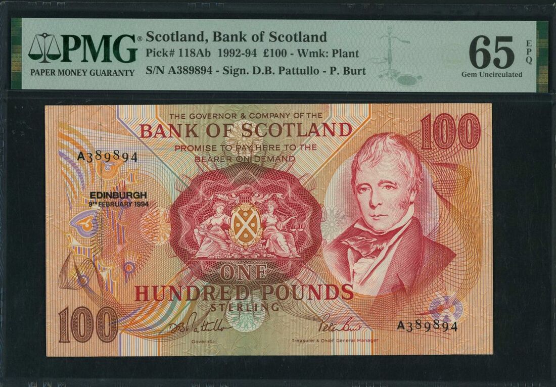 Scotland, Bank of Scotland, £100, Edinburgh, 9th February 1994, serial number A389894, (Pick 118Ab), in PMG holder 65EPQ Gem Uncirculated