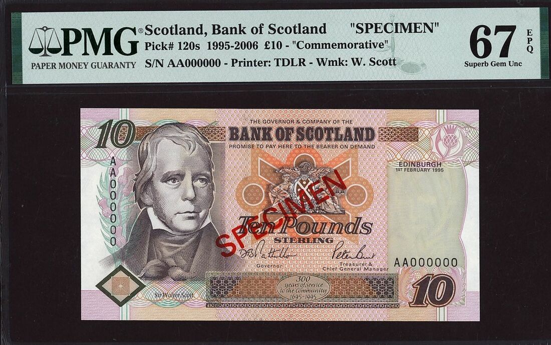 (x) Bank of Scotland, [Top Pop] specimen £10 commemorative, 1st February 1995, serial number AA0000000, (Pick 120s), in PMG holder 67 EPQ Superb Gem Uncirculated