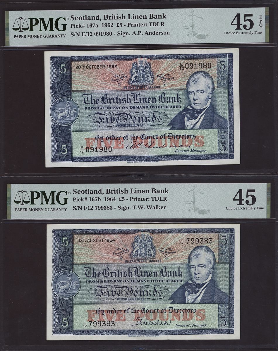 (x) British Linen Bank, Scotland, pair of £5 banknotes £5, 20th October 1962, serial number E/12 091980,