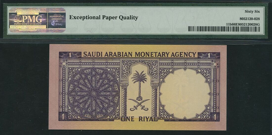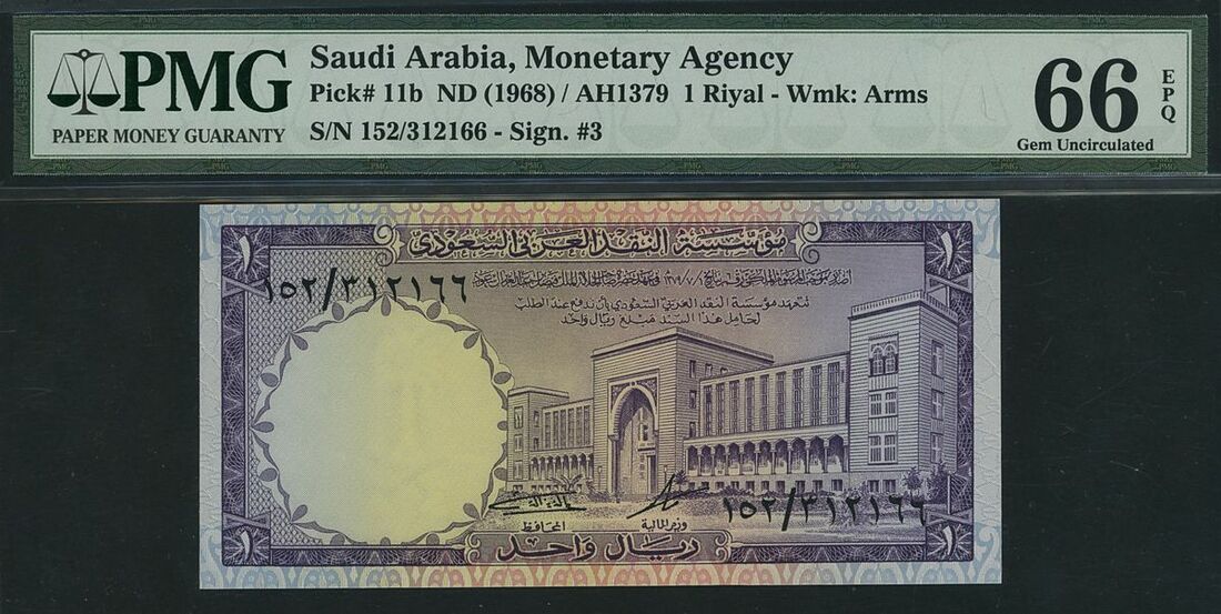 (x) Saudi Arabia Monetary Agency, 1 Riyal, ND (1968), serial number 152/312166, (Pick 11b, BNB 110), in PMG holder 66 EPQ Gem Uncirculated