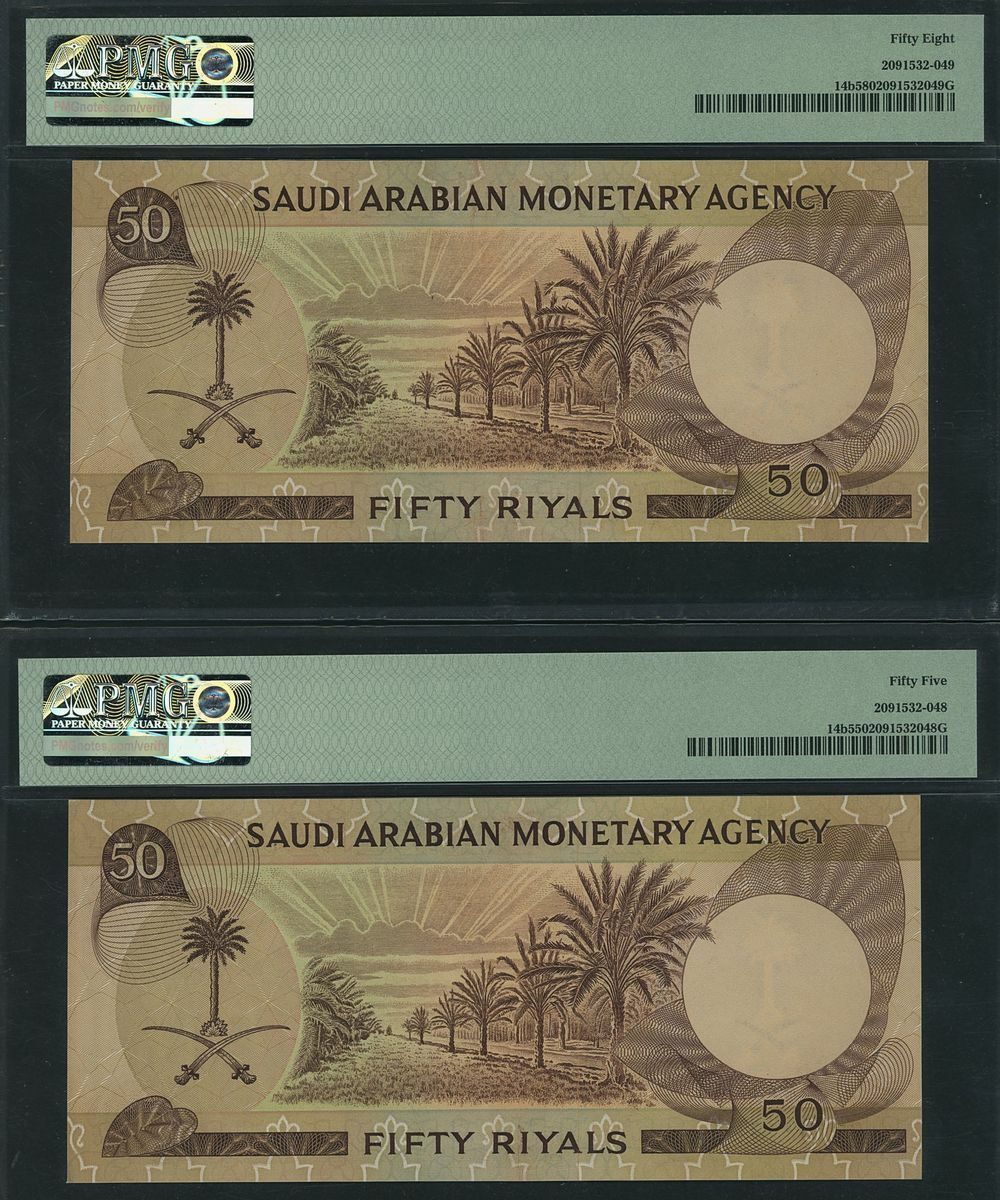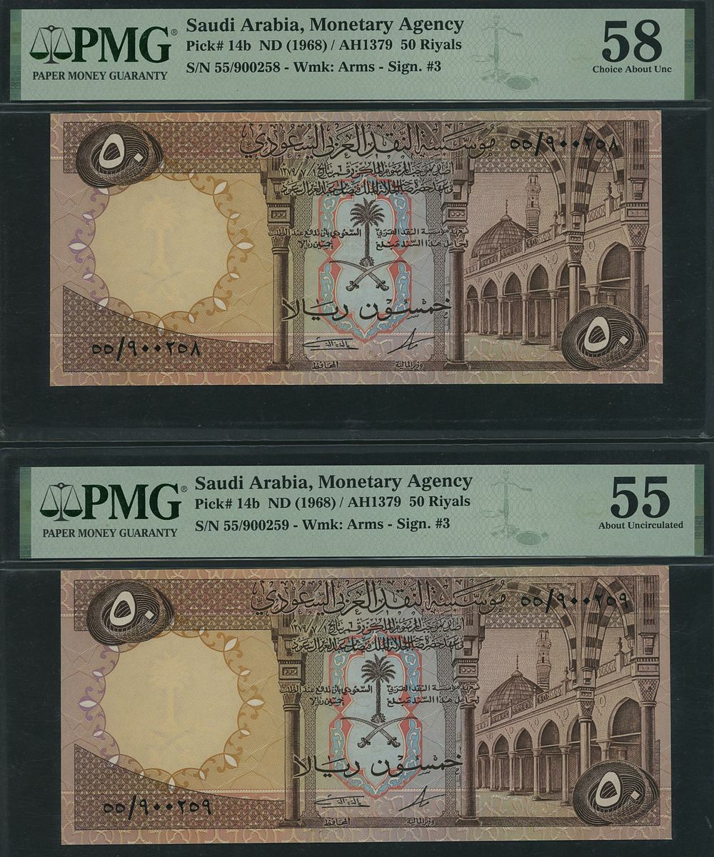 (x) Saudi Arabia Monetary Agency, Consecutive pair of 50 Riyals, ND (1968), serial number 55/900258-59, (Pick 14b, BNB 113), in PMG holder 58 Choice About Uncirculated (1), 55 About Uncirculated (1), (2 notes)