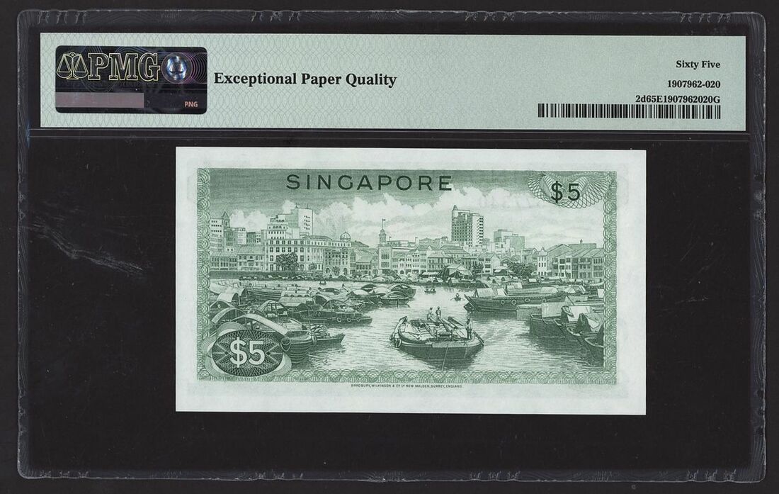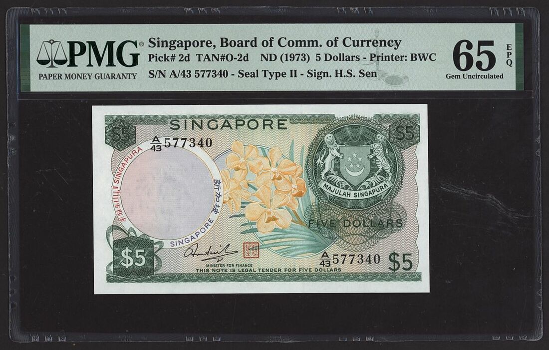 (x) Board of Commissioners of Currency, Singapore, 5 Dollars, ND (1973), serial number A/43 577340, (Pick 2d, TAN#O-2d, BNB 102), in PMG holder 65 EPQ Gem Uncirculated