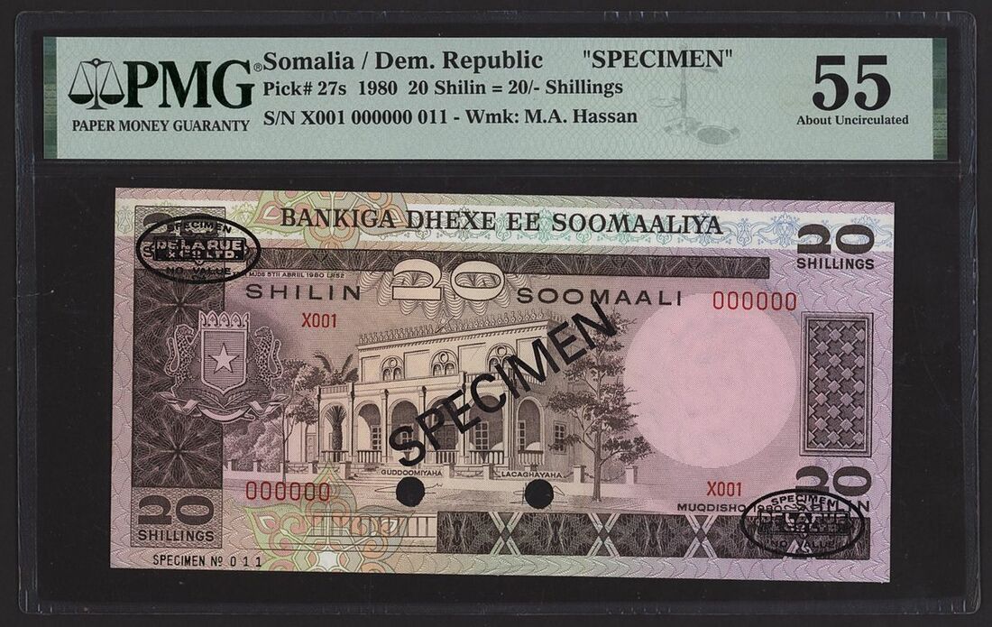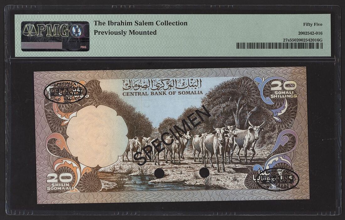 (x) Central Bank of Somalia, specimen 20 Shilin = 20/- Shillings, 5th April 1980, serial number X001 00000 011, (Pick 27s, BNB 304), in PMG holder 55 About Uncirculated, previously mounted, Ex Ibrahim Salem Collection
