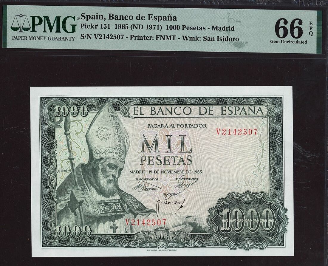 (x) Banco de Espana, Spain, 1000 Pesetas, 19th November 1965, serial number V2142507, (Pick 151, BNB 617), in PMG holder 66 EPQ Gem Uncirculated