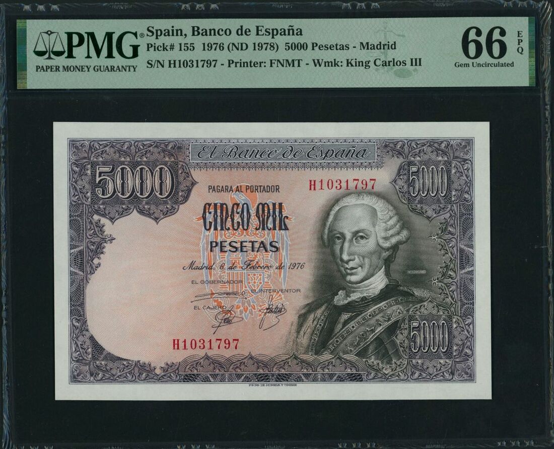 Spain, Banco de Espana, 5000 Pesetas, Madrid, 6th of February 1976, serial number H1031797, watermark: King Carlos III