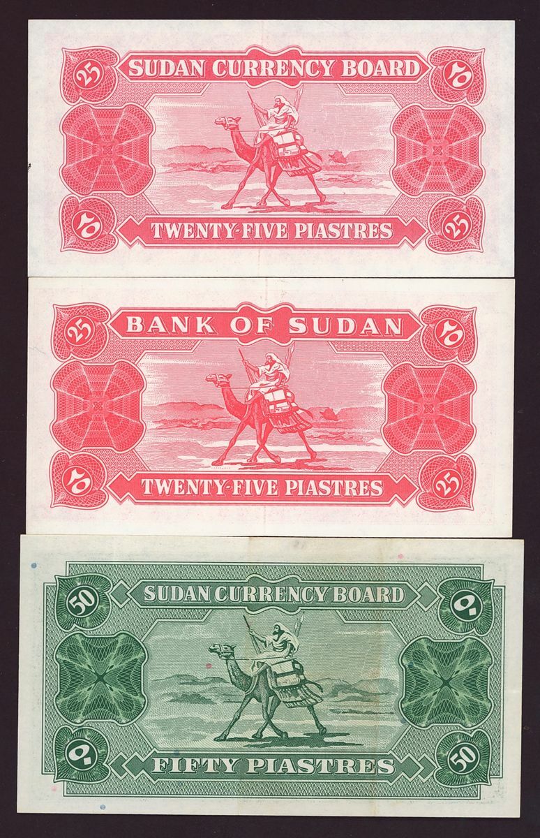 Sudan, Sudan Currency Board, three assorted notes, two 25 piastres, one 50 piastres, 1956-67, (Pick 1Aa, 2Ba, 6b, BNB 206a, 202a, 301c), About Uncirculated, Extremely Fine, About Uncirculated