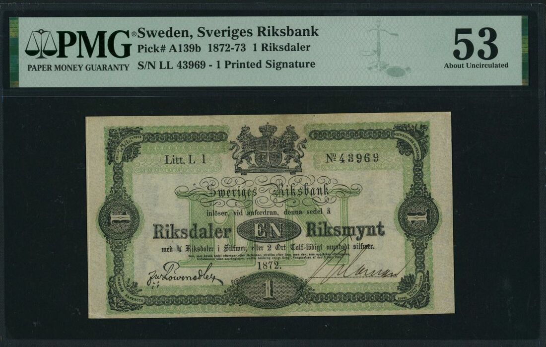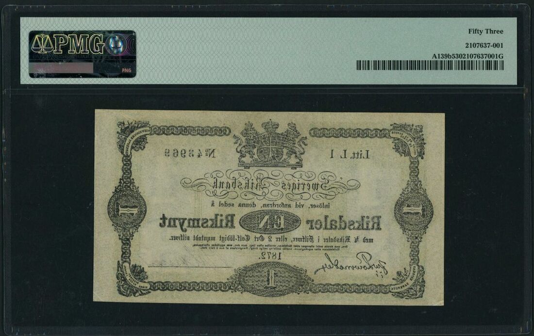 (x) Sweden, Sveriges Riksbank, 1 riksdaler, 1872, serial number LL 43969, (Pick A139b, BNB 238a), in PMG holder 53 About Uncirculated