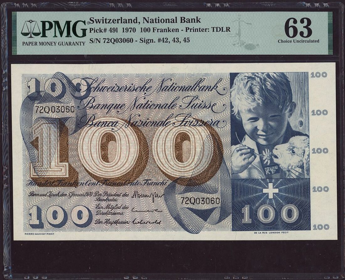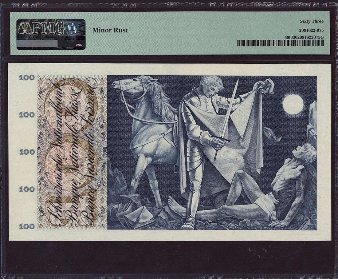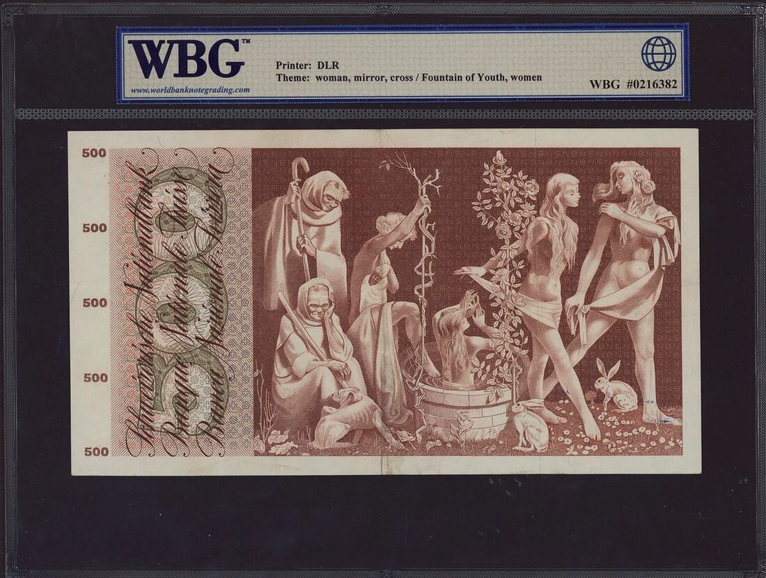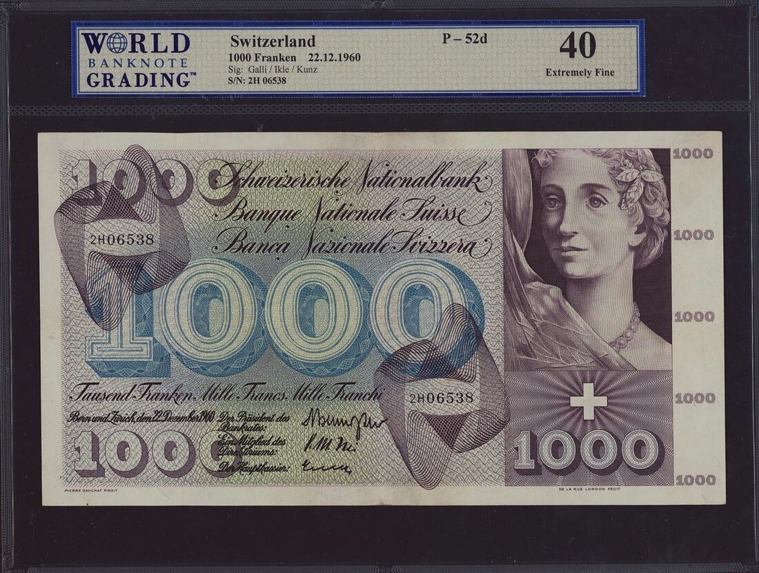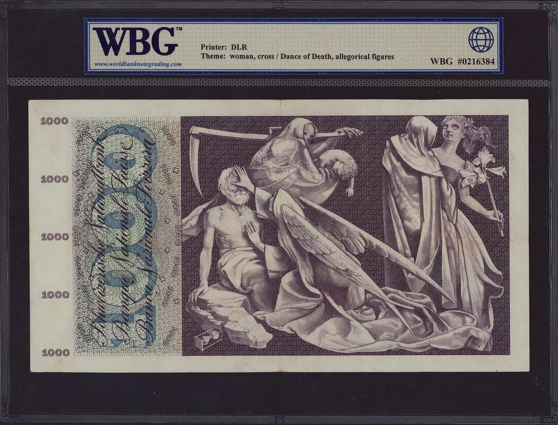 (x) Switzerland, National Bank, [3 notes] 100, 500, 1000 Franken, (1960-70), these exquisite banknotes showcase quintessential Swiss portraits on their obverse sides, while their reverse sides boast detailed allegorical illustrations. Among these mesmerizing artworks, scenes depicting the mythical Fountain of Youth and the eternal dance between life and death stand out, transforming these banknotes into unique pieces of art. Bold and vibrant colors further enhance their visual appeal, making them highly desirable. Crafted during a period of prosperity and stability in Switzerland, these banknotes not only reflect the nation's financial strength but also celebrate its rich cultural heritage. The inclusion of text in three languages, French, German, and Italian, adds a multicultural dimension, representing the diverse linguistic and cultural tapestry of Switzerland