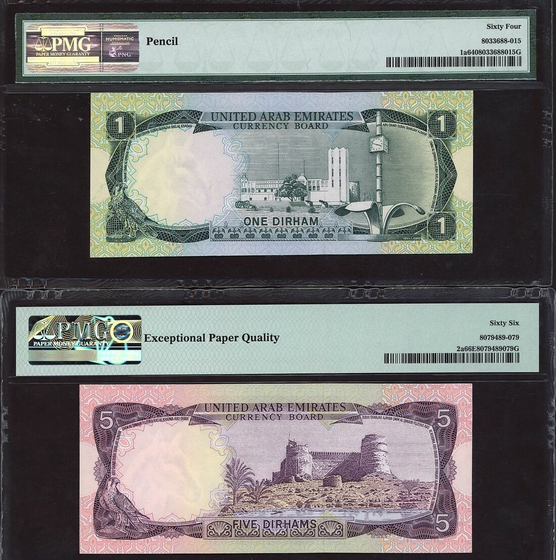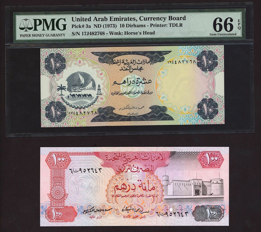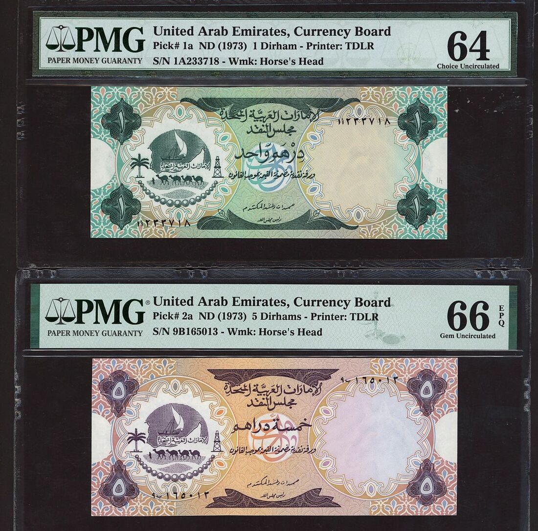 (x) United Arab Emirates, Central Bank, Currency Board, [4 notes] 1, 5, 10 dirhams, 1973-1982, (Pick 1a, 2a, 3a, 10a, BNB 101a, 102a, 103a, 204a), in PMG holders 64 Choice Uncirculated (1),66 EPQ Gem Uncirculated (2), and uncirculated, counting crease (1) (4 notes)