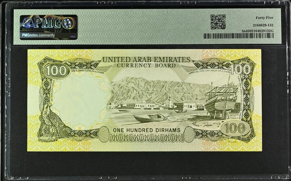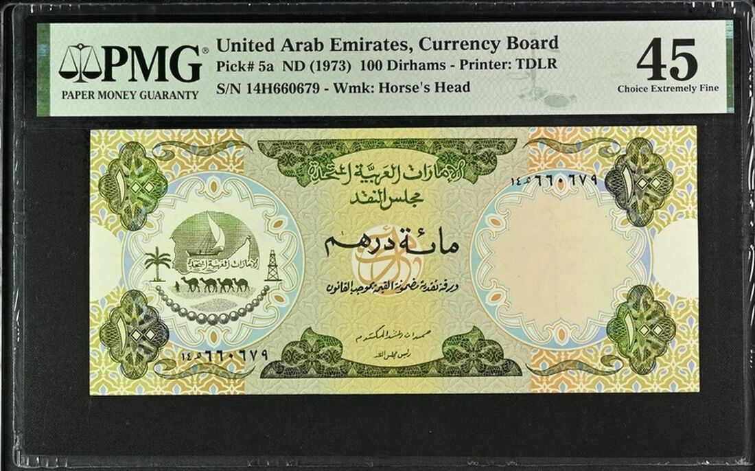 United Arab Emirates Currency Board, 100 Dirhams, ND (1973), serial number 14H660679, (Pick 5, BNB 105), In PMG holder 45 Choice Extremely Fine