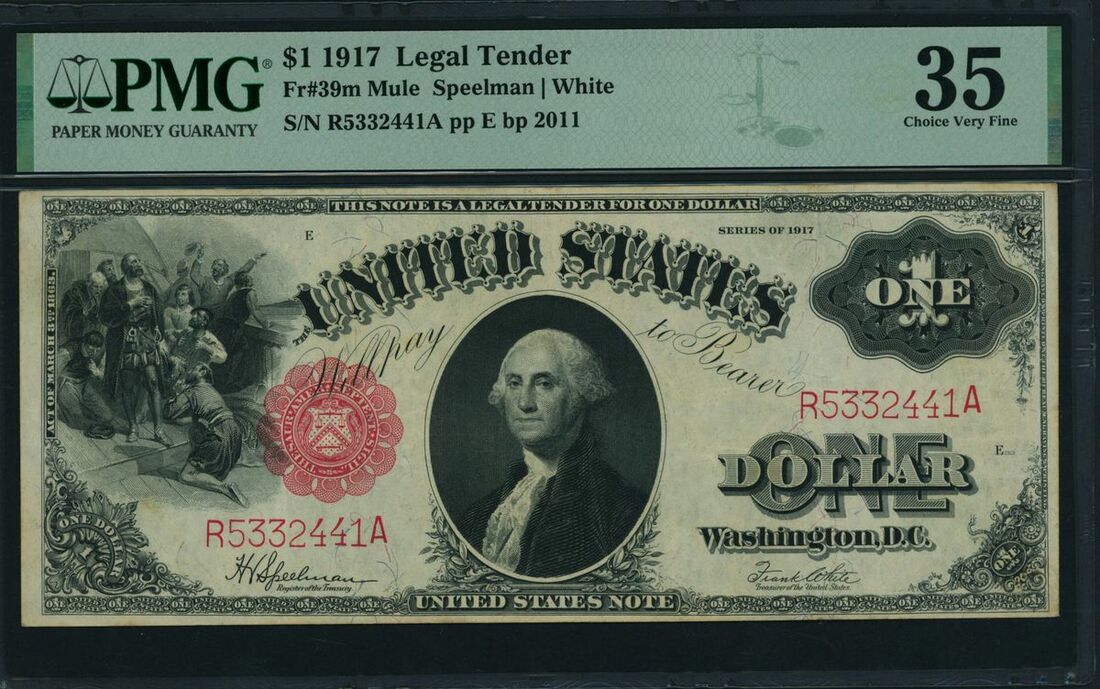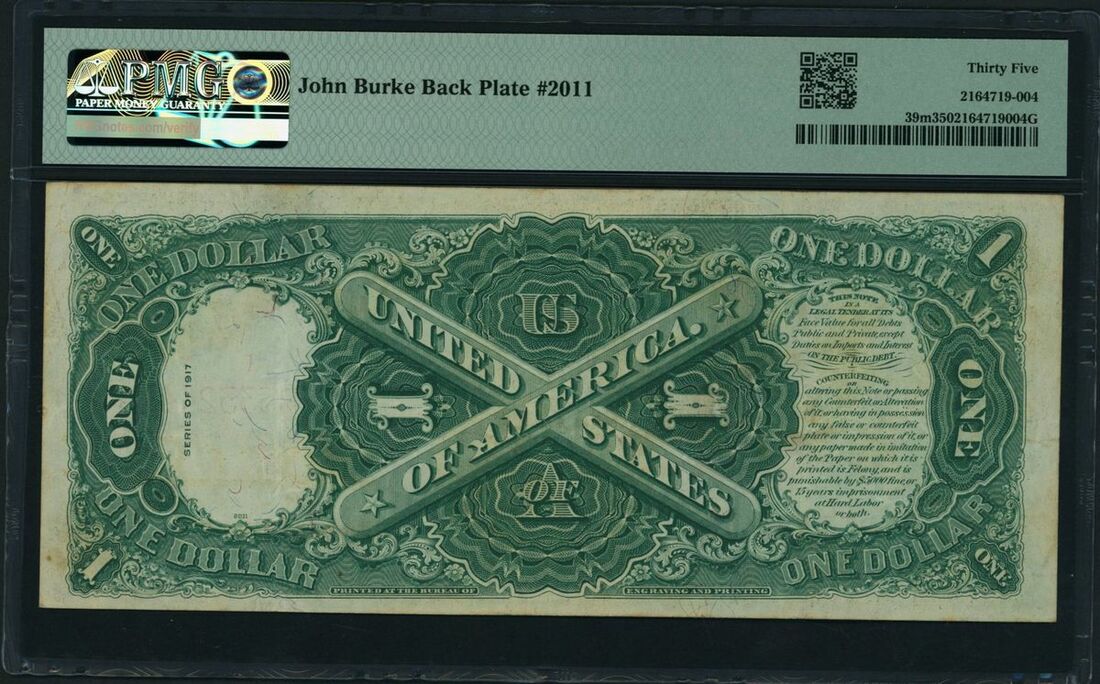 United States of America, $1 Legal Tender, Large Size, 1917, serial number R5332441A pp E bp 2011, (Fr 39m Mule), in PMG holder 35 Choice Very Fine, John Burke Back Plate #2011