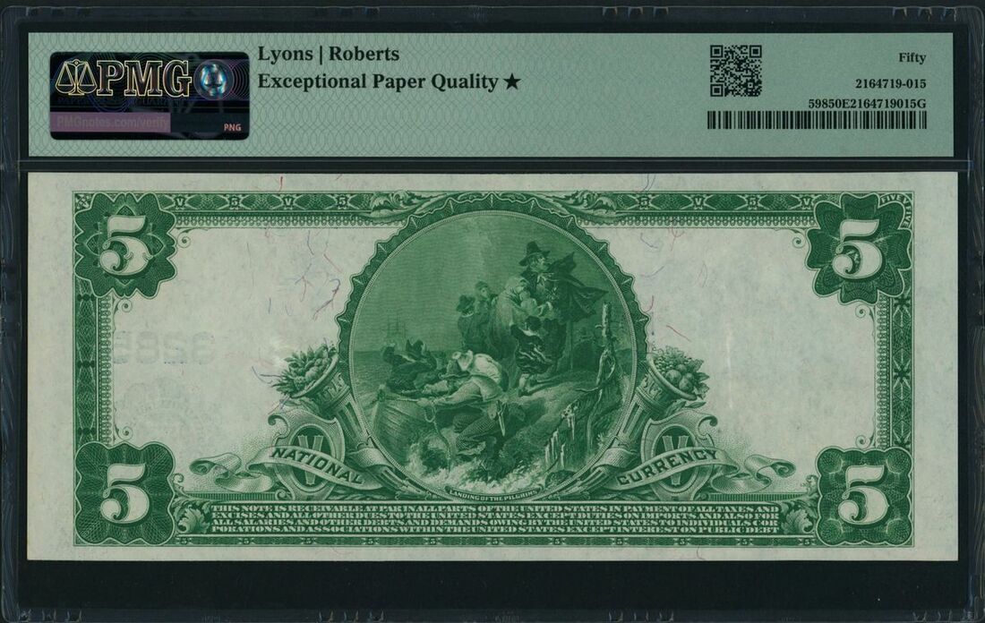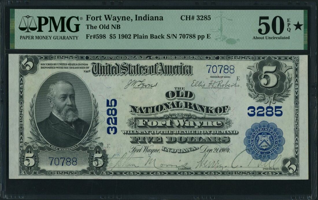 Old National Bank of Fort Wayne, Indiana, USA, $5, 1902 Plain Back, serial number 70788 pp E, CH 3285, (Fr. 598), in PMG holder 50 EPQ * Star About Uncirculated