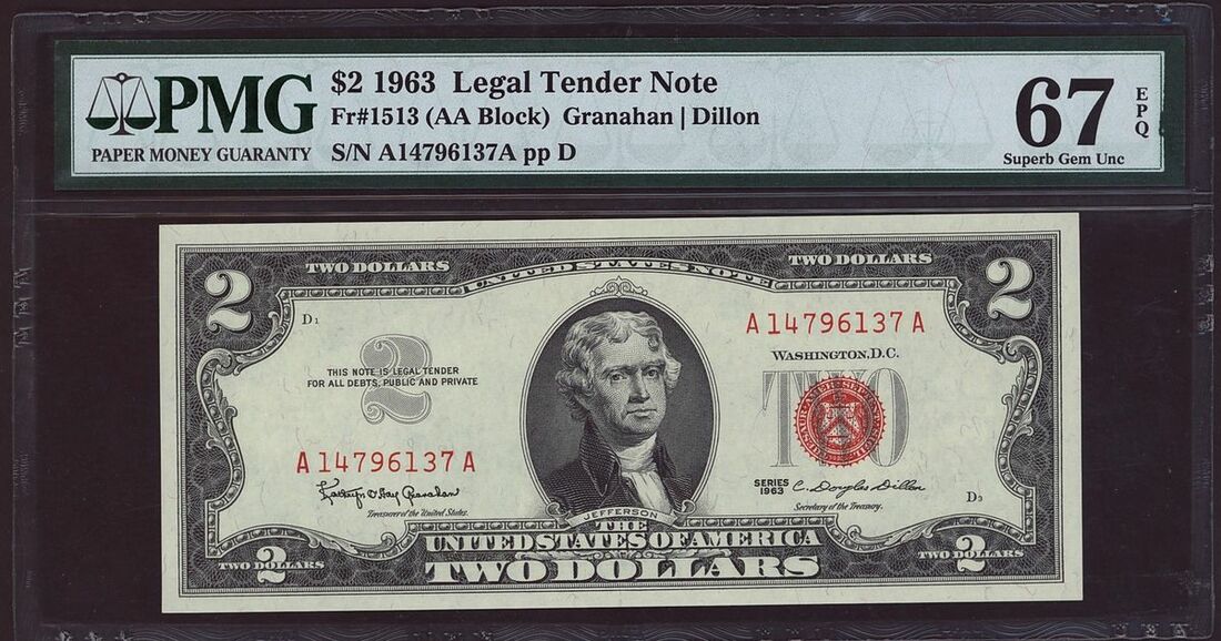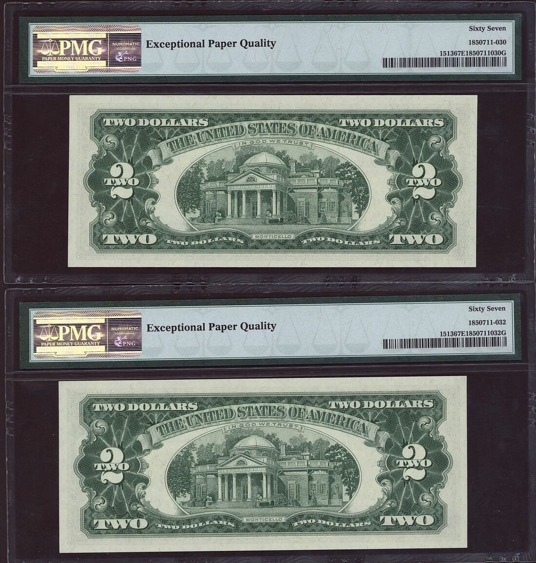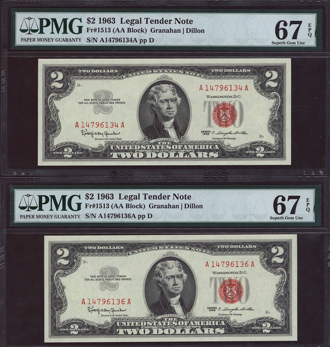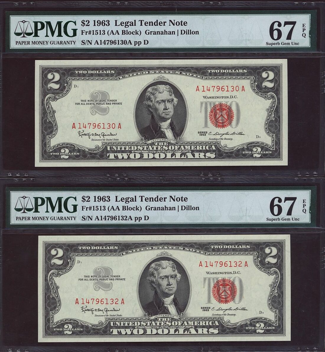 USA, Legal Tender Note, five $2 notes, 1963, two consecutive serial numbers, two consecutive serial numbers, three nearby serial numbers