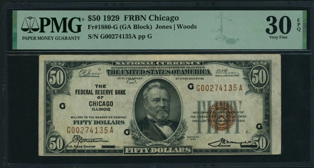 Federal Reserve Bank of Chicago, USA, $50, 1929, serial number G00274135A pp G, (Fr. 1880-G), in PMG 30 EPQ Very Fine