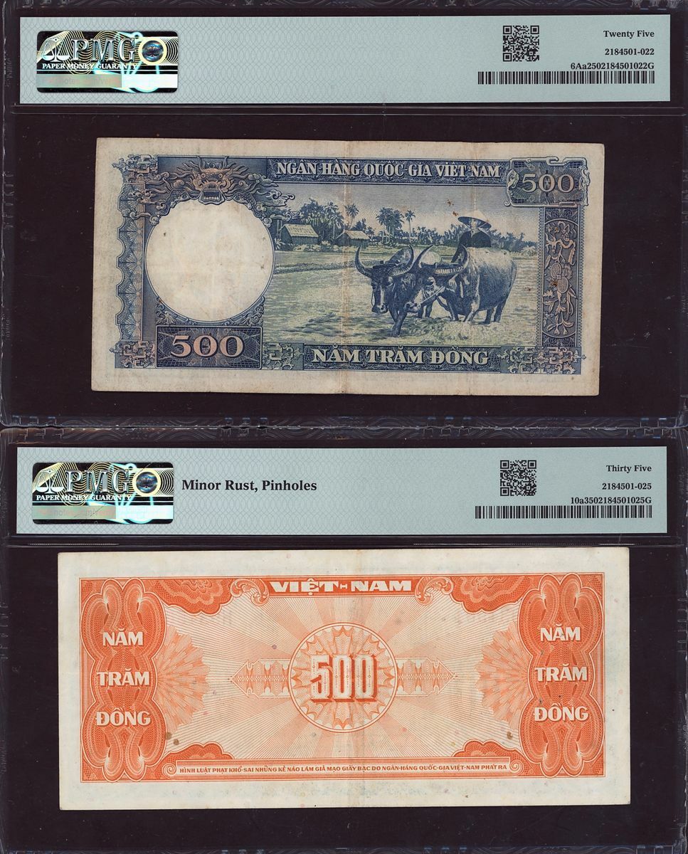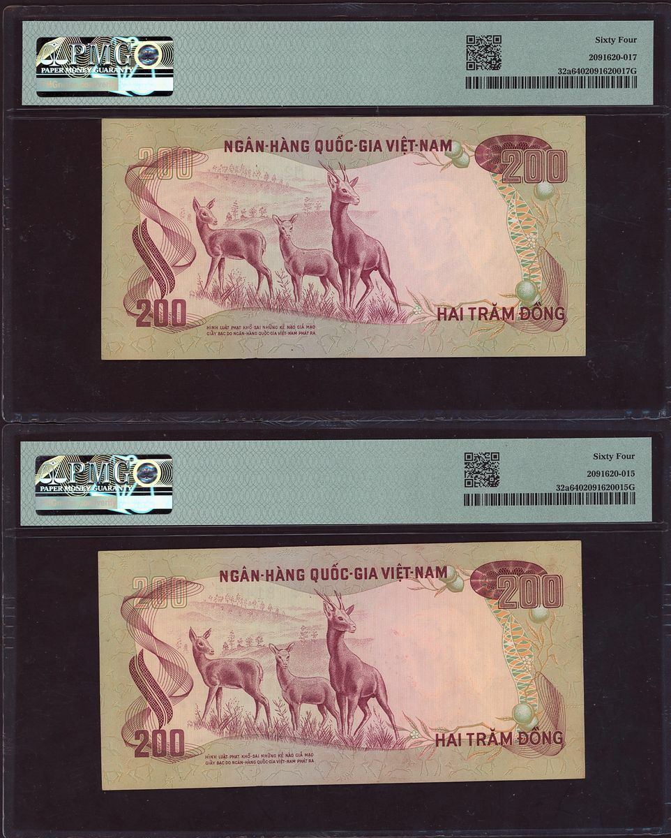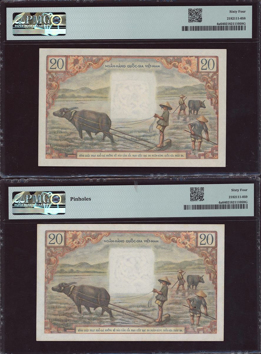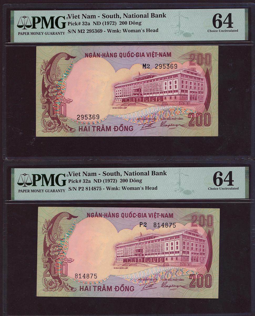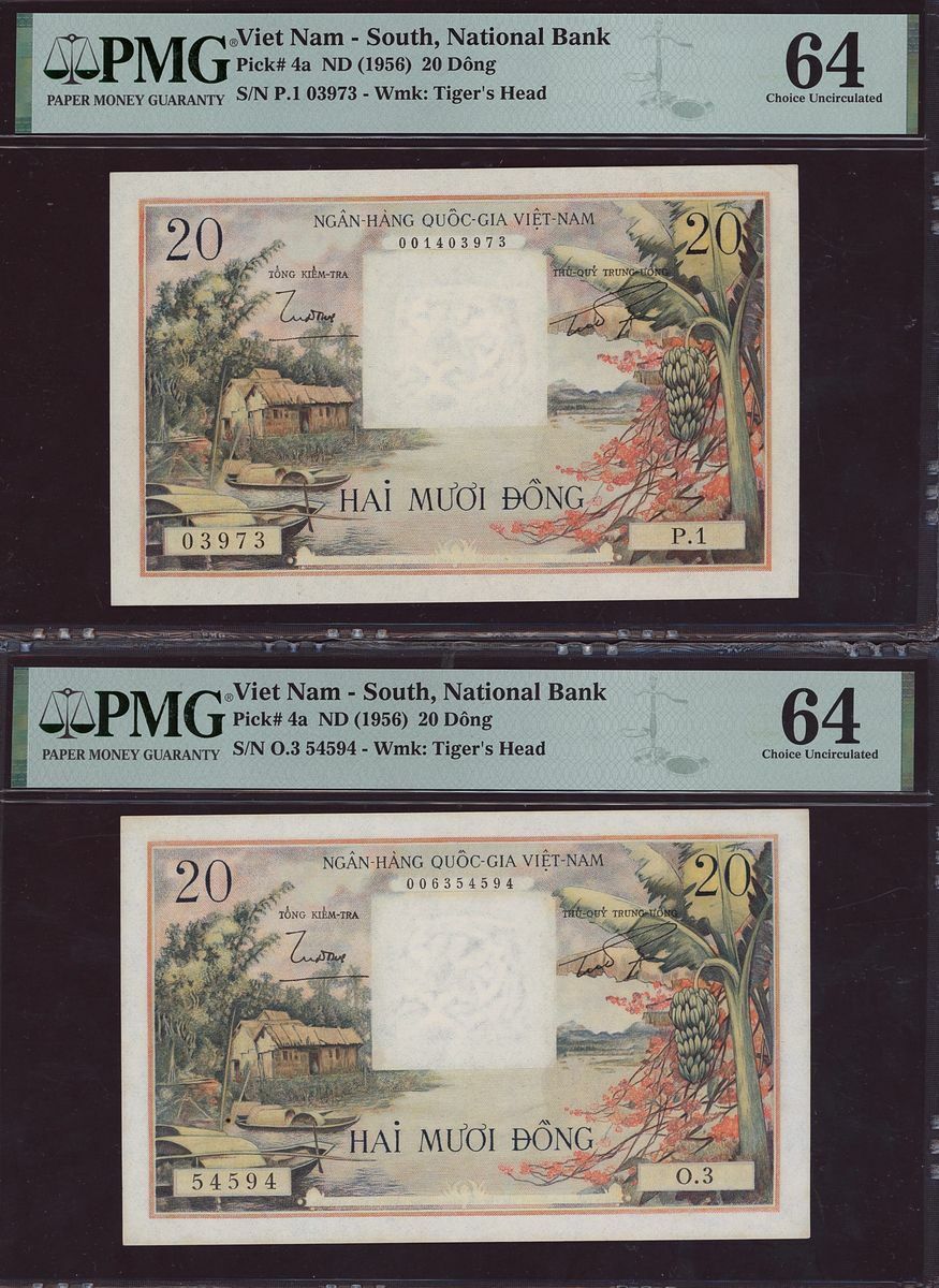 (x) National Bank, South Vietnam, six assorted notes, 20, 500, 200 dong, ND (1955-1972), (Pick 4a, 4a, 6Aa, 10a, 32a, 32a, BNB 111a, 111a, 118a, 109a, 134a, 134a), in PMG holders 64 Choice Uncirculated, 64 Choice Uncirculated, 25 Very Fine, 35 Choice Very Fine, 64 Choice Uncirculated, 64 Choice Uncirculated, minor rust in one note and pinholes in two