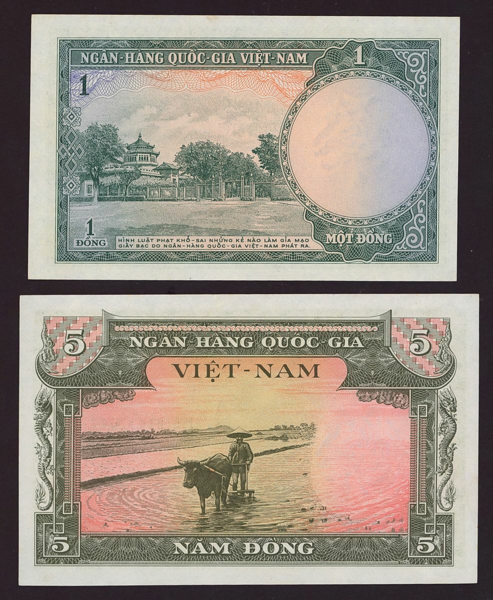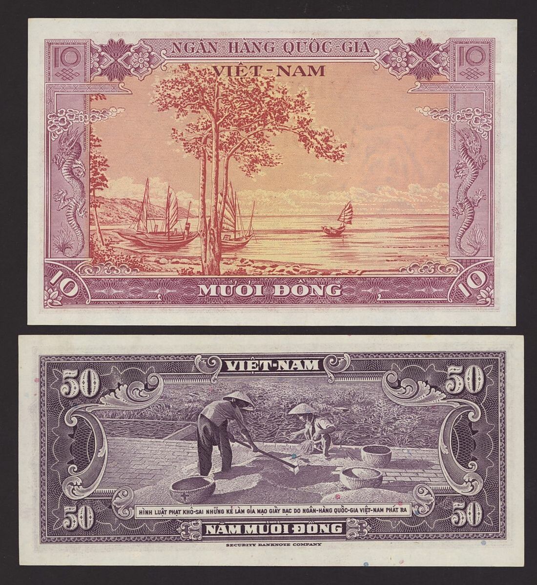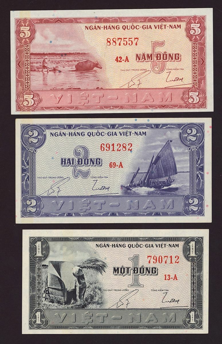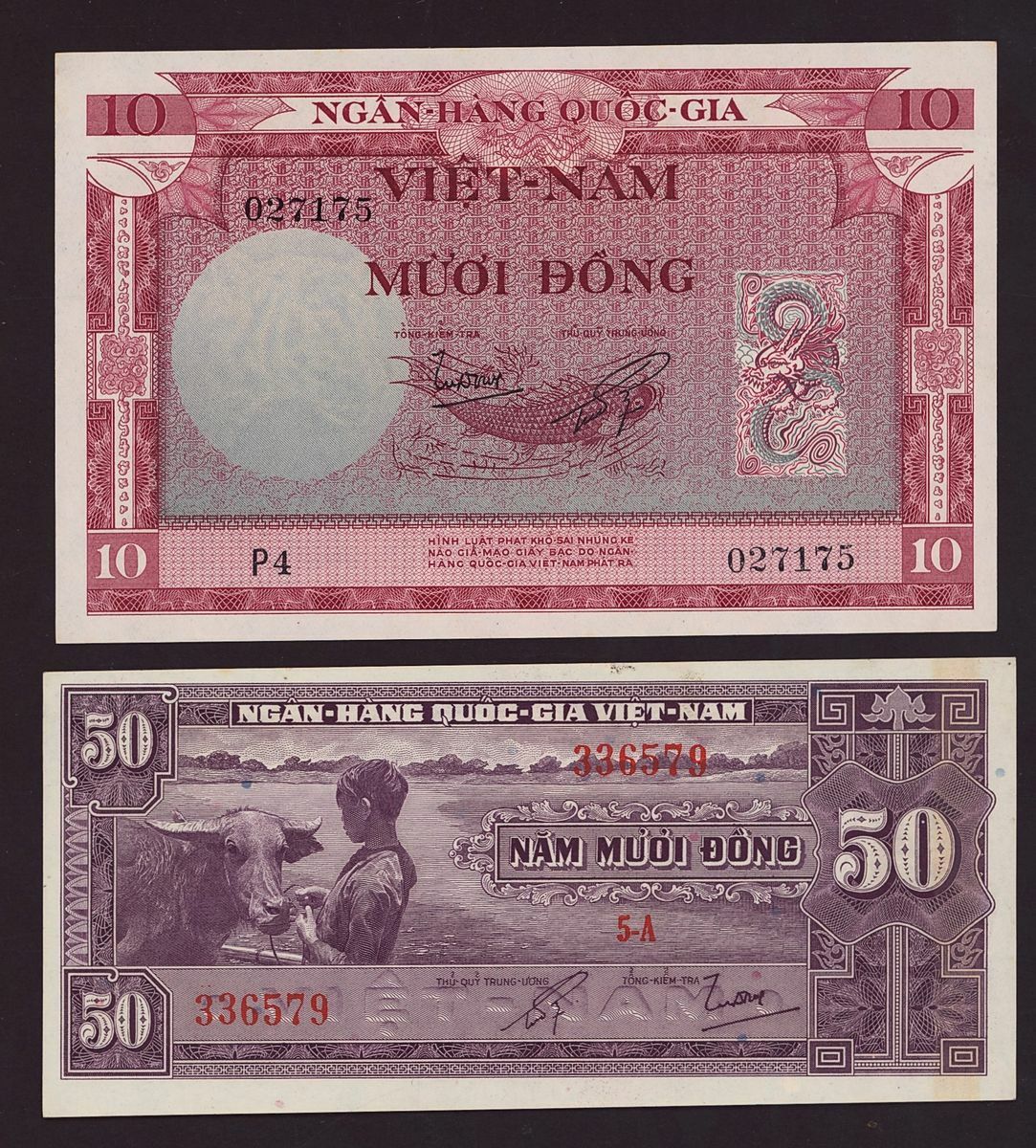 (x) South Vietnam, [9 notes] 1 2 5 10 50 100 200 dong, ND (1955-56), (Pick 11a, 12a, 13a, 1a, 2a, 3a, 7a, 8a, 9a, BNB 101a, 102a, 103a, 110a, 104b, 105b, 112a, 106a, 117a), good very fine to about uncirculated (9 notes)
