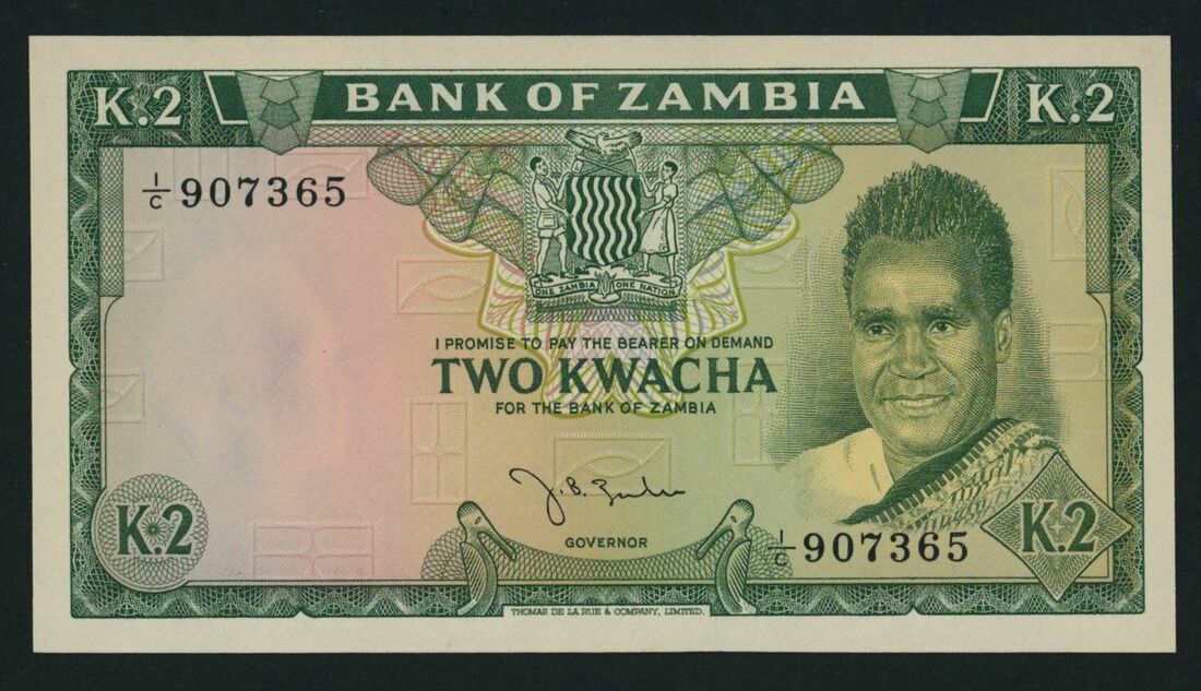 Zambia, Bank of Zambia, 2 kwacha, ND (1968), serial number 1/C 907365, first set