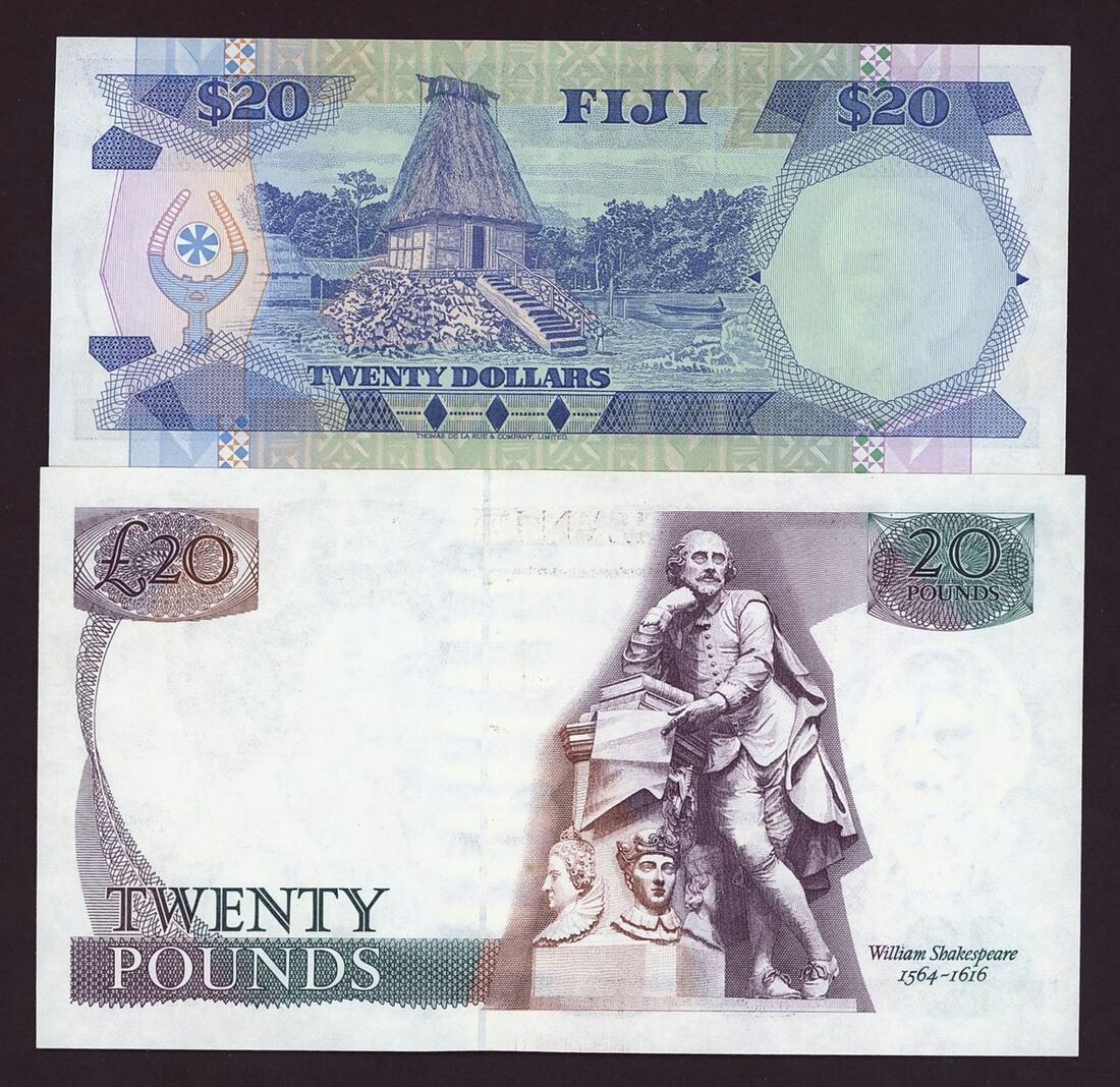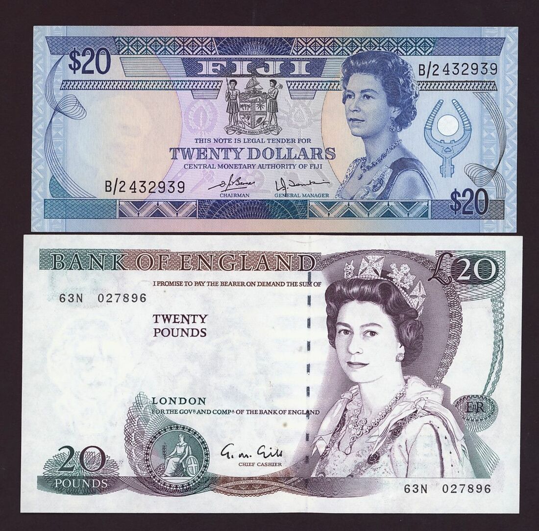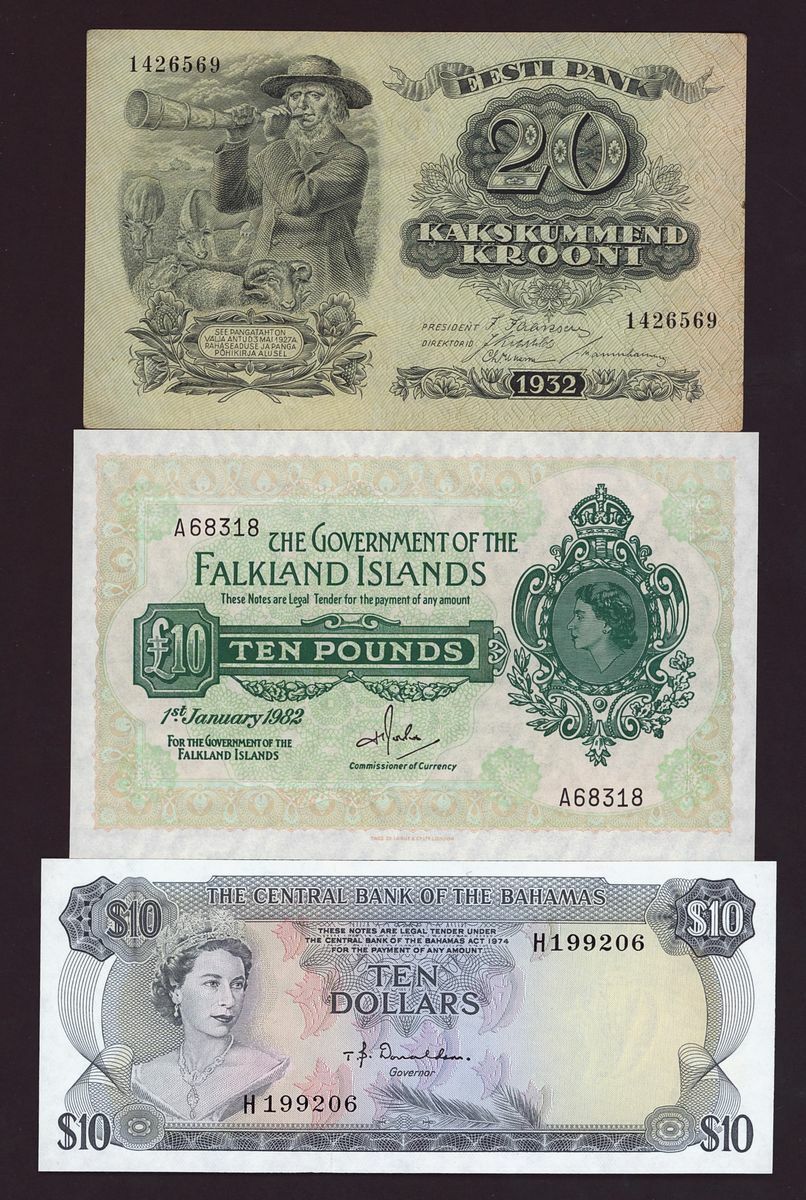 (x) Bahamas, Estonia, Falkland Islands, Fiji, Great Britain, [5 notes] various currency and denomination, 1932-1988 a truly eclectic collection of world currency, seamlessly weaving together the heritage of five nations and brought together to showcase their artistry and vivid colours. This assemblage features: $10 Bahamas, Central Bank; 20 Krooni Estonia, Bank of Estonia; £10 Falkland Islands; $20 Fiji, Central Monetary Authority; £20 Great Britain, Bank of England. With the exception of the Estonian note, each serves as an enduring testament to the indelible legacy of the British monarchy, featuring the portrait of our late queen. This remarkable collection extends an invitation to delve into the wide-reaching treasury of banknote artistry