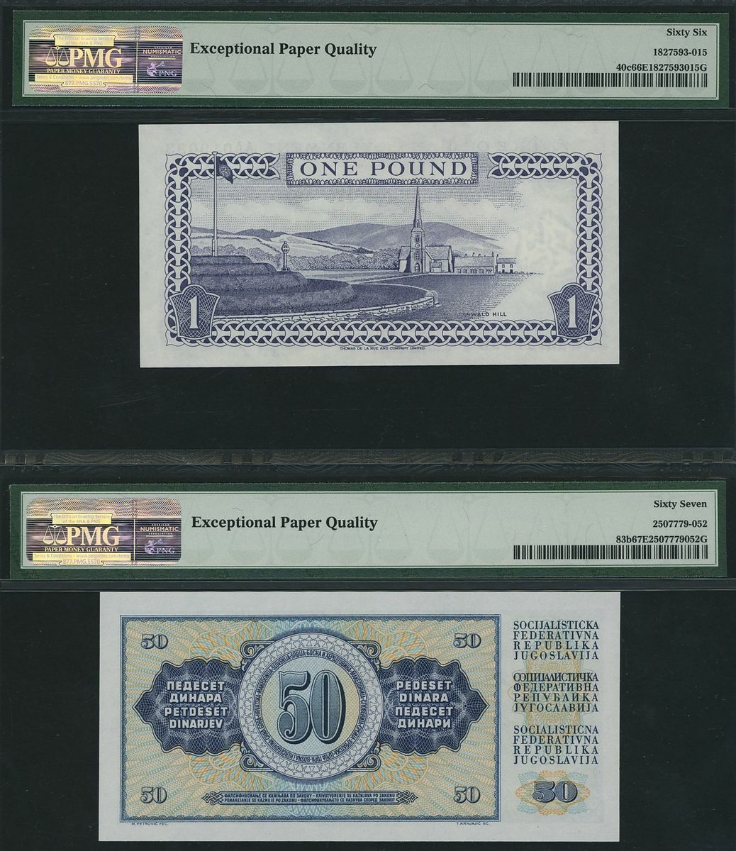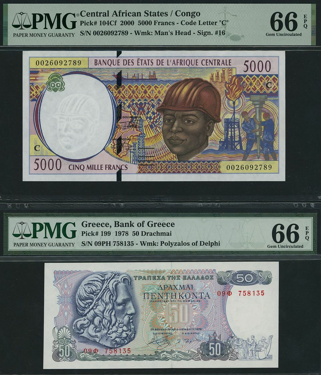 Central African States, Greece, Isle of Man, Yugoslavia, four assorted notes, various currencies and denominations, 1968-2000, (Pick 104Cf, 199, 40c, 83b, BNB 104Cf, BOG 199, 114c, 411b), in PMG holders 66EPQ Gem Uncirculated, 66EPQ Gem Uncirculated, 66EPQ Gem Uncirculated, and 67EPQ Superb Gem Uncirculated