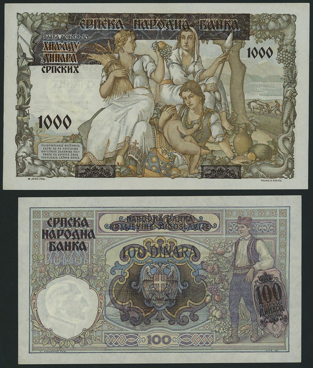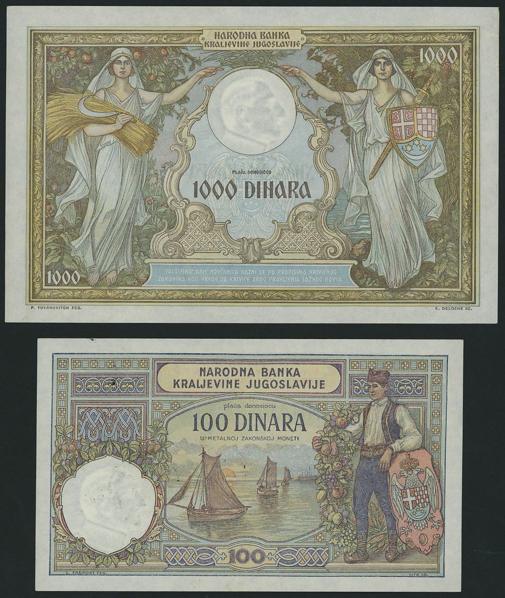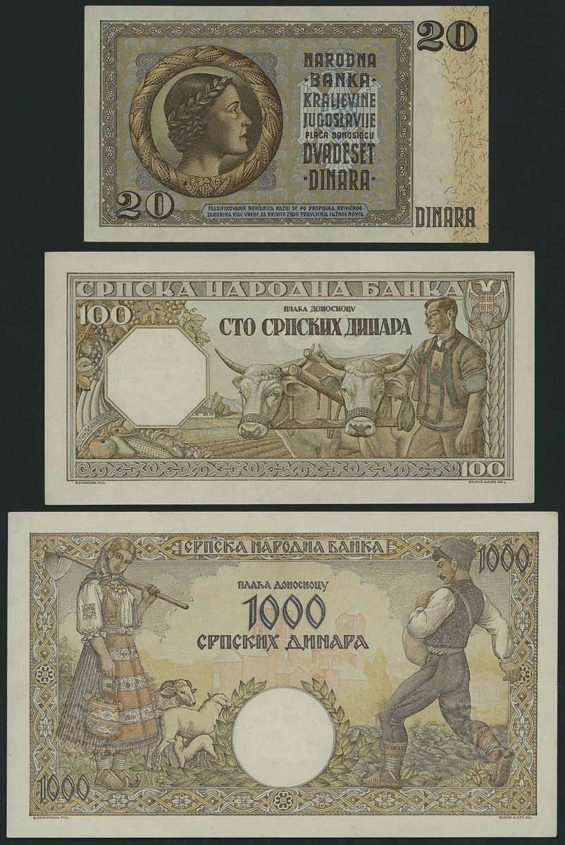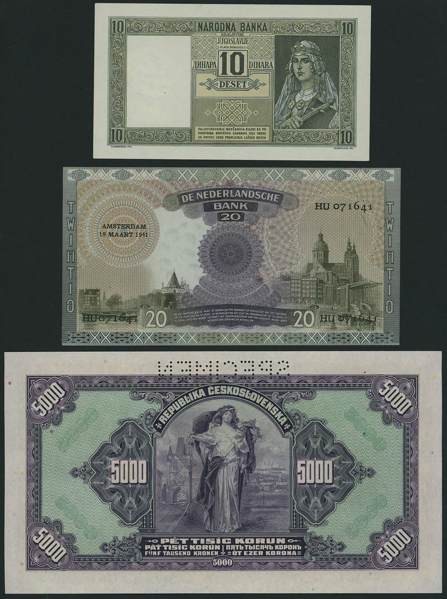 (x) Czechoslovakia, Netherlands, Romania, Serbia, Yugoslavia, [13 notes] various denominations, 1920-1943, A pleasing assemblage of European banknotes, showcasing beautiful and detailed artwork. Includes a specimen Czechoslovakian note, sporting vivid colours and in exemplary condition.