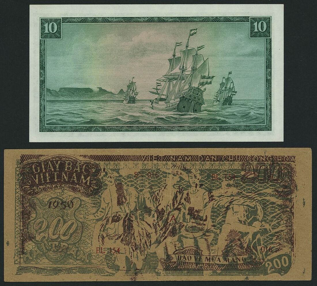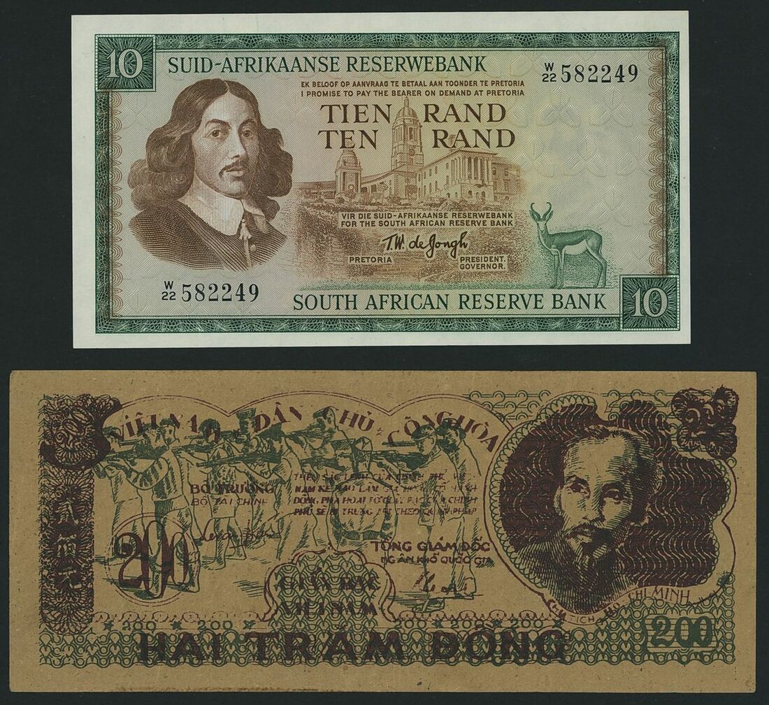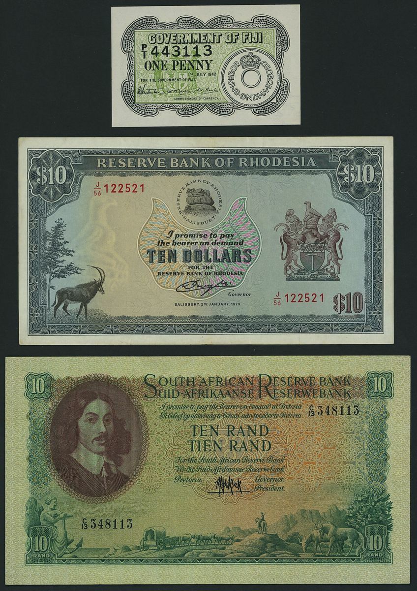 (x) Fiji, Rhodesia, South Africa, Vietnam, five assorted notes, various denominations and currency, 1942-1979 An eclectic mix of world banknotes: one Fiji note; two from South Africa; one Rhodesian, and one from Vietnam. The Fiji note in particular is interesting, as it is a 1942 emergency issue banknote. Such notes were printed on watermarked sheets of paper, thus feature irregular watermarks. This note has a visible watermark on the right side