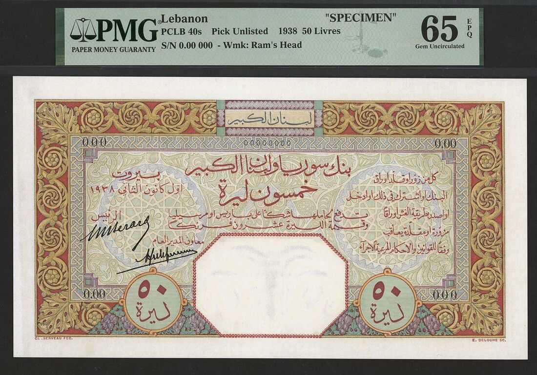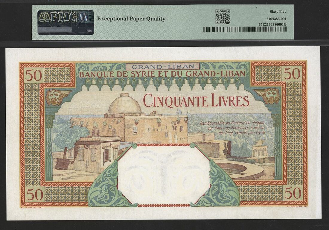 Banque de Syrie et du Grand-Liban, Lebanon, specimen 50 livres, 1938, serial number 00000000, this spectacular note captivates the viewer with vibrant hues and striking motifs, embodying the essence of Lebanese artistry. It features a myriad of colours, notably characterised by a prominent red border, contrasted by intricate blue and green patterns at its centre. The note features both French and Arabic text and, on its reverse side, showcases an illustration of the Baddawi Mosque, situated in the north of Tripoli