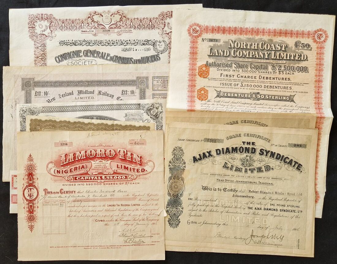 A miscellaneous selection of Bonds and share certificates, including South Africa, Ajax Diamond Syndicate Limited, 190[6], 3 examples; Compagnie Générale d'Omnibus et d'Autobus de Constantinople, 1910 and New Zealand Midland Railway Co. Ltd., £12 10s, 1895. Minor discolouration on the first which are scarce, generally VF.