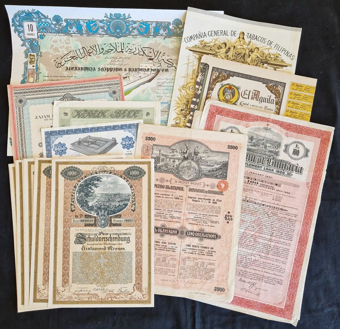 (x) A Mixed lot of Bonds and Share certificates comprising, Bulgaria 1909 Loan, 2500 francs; Bulgaria, 7% Settlement Loan, 1926, £100, lacks coupons; France, L'Hippodrome, part bénéficiaire, 1898; Spain, Compañia de las Hulleras de Ujo-Mieres, 1904; Portugal, Carregadores Acoreanos, 1 share, 1920, 2 examples, one somewhat trimmed around edges; Vienna, 1921, 1000 kronen bonds, 10 examples, and, others (8). Generally VF and better (24).