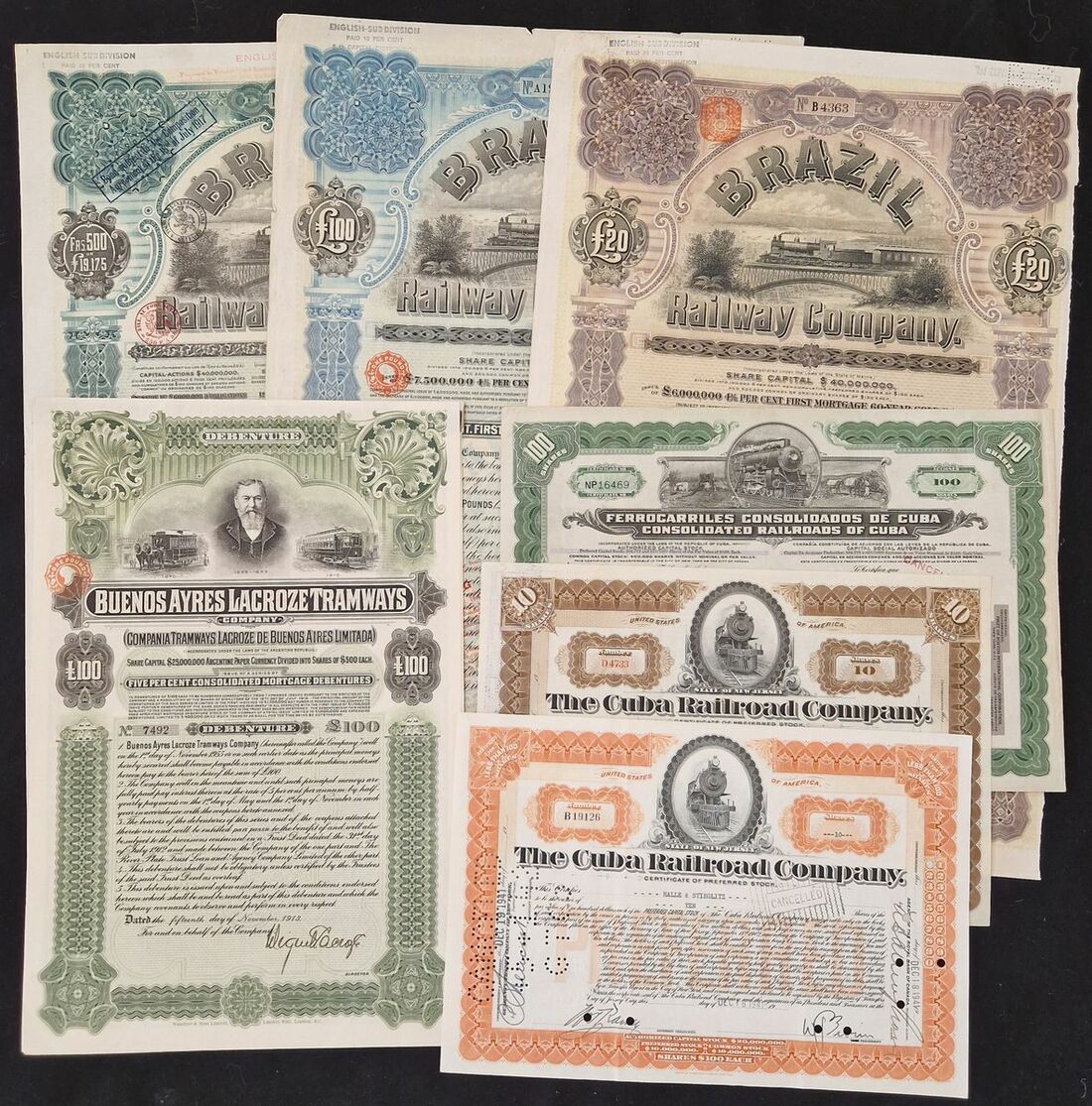 (x) Latin America: A small group of Railway and Tramway certificates, comprising Brazil Railway Company, 1909 bonds for £20, £100 and 500 francs; Buenos Ayres Lacroze Tramways, £100, 1913; Cuba Railroad Company, 10 shares, 1914 and less than 100 shares, 1941, and, Consolidated Railroads of Cuba, 100 shares, 1938. Generally VF and better (7).